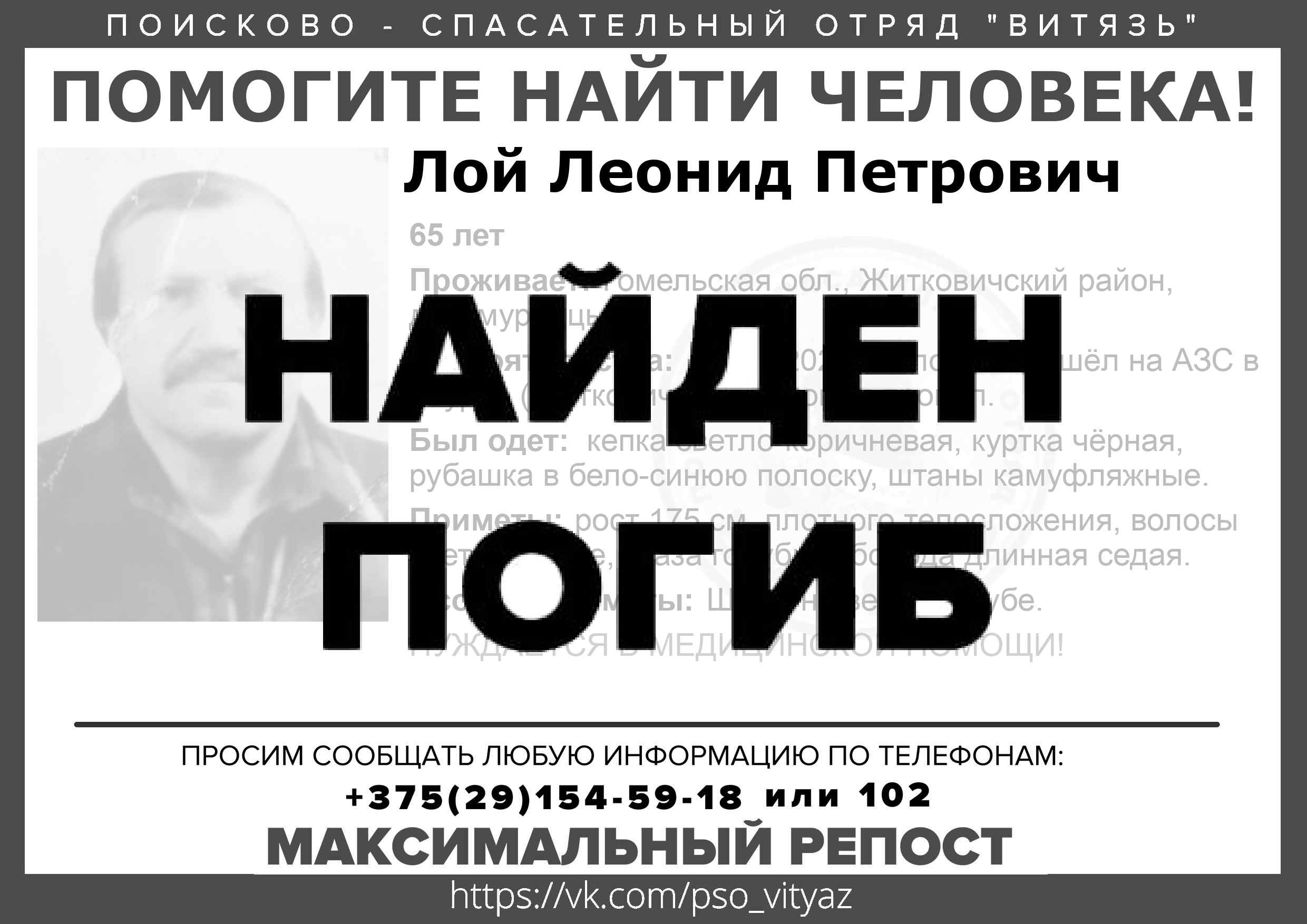 Всех, кто владеет информацией, просим сообщить: ПСО "ВИТЯЗЬ" +375(29)154-59-18 |