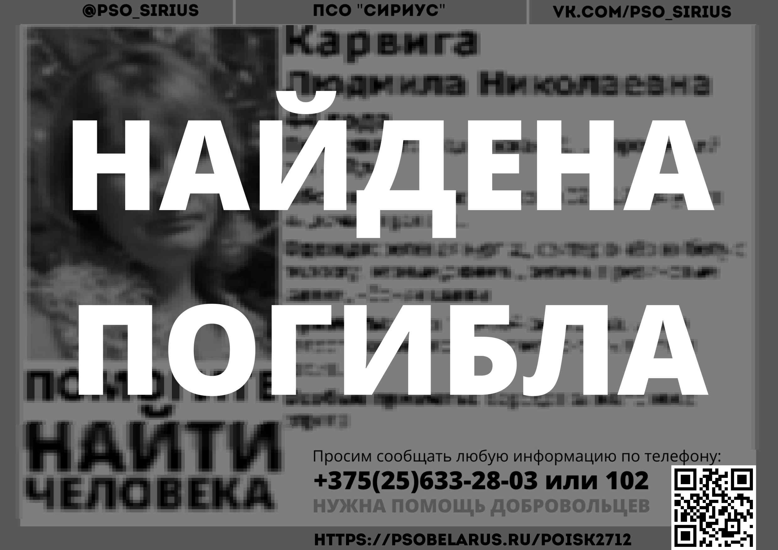 Всех, кто владеет информацией, просим сообщить: ПСО "Сириус" +375(25)633-28-03 |