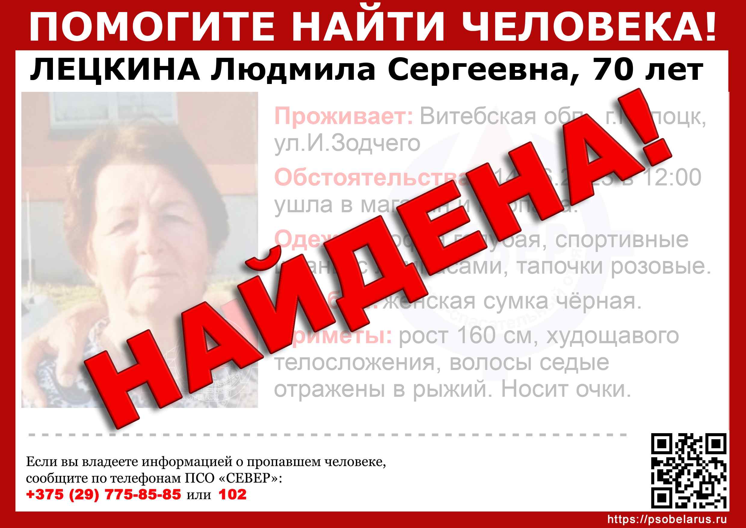 Скачать ориентировкуДля оперативного получения информации о пропавших людях и сборах на поиски можно подписаться на бота оповещения: Телеграм
