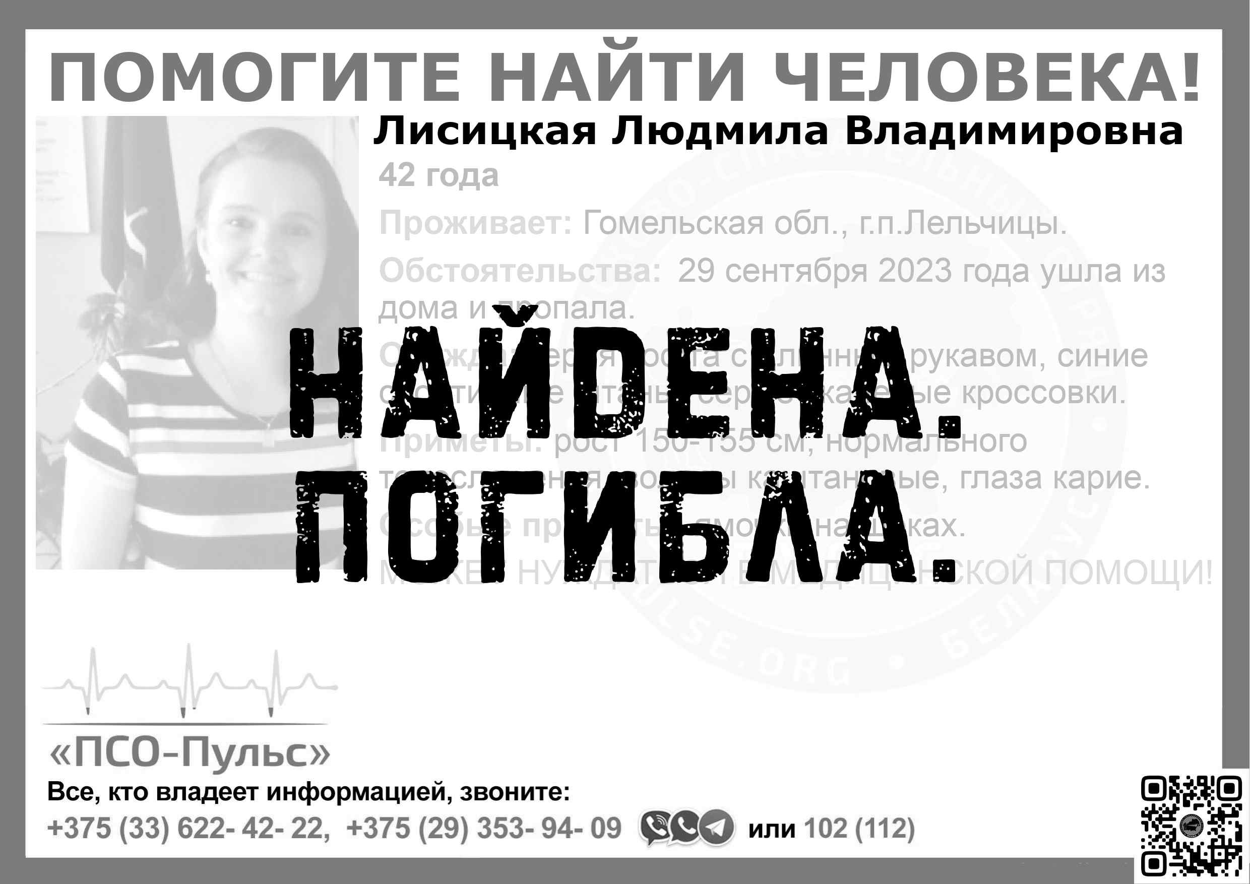 Всех, кто владеет информацией, просим сообщить: ПСО "ПСО-Пульс" +375(33)622-4222 |