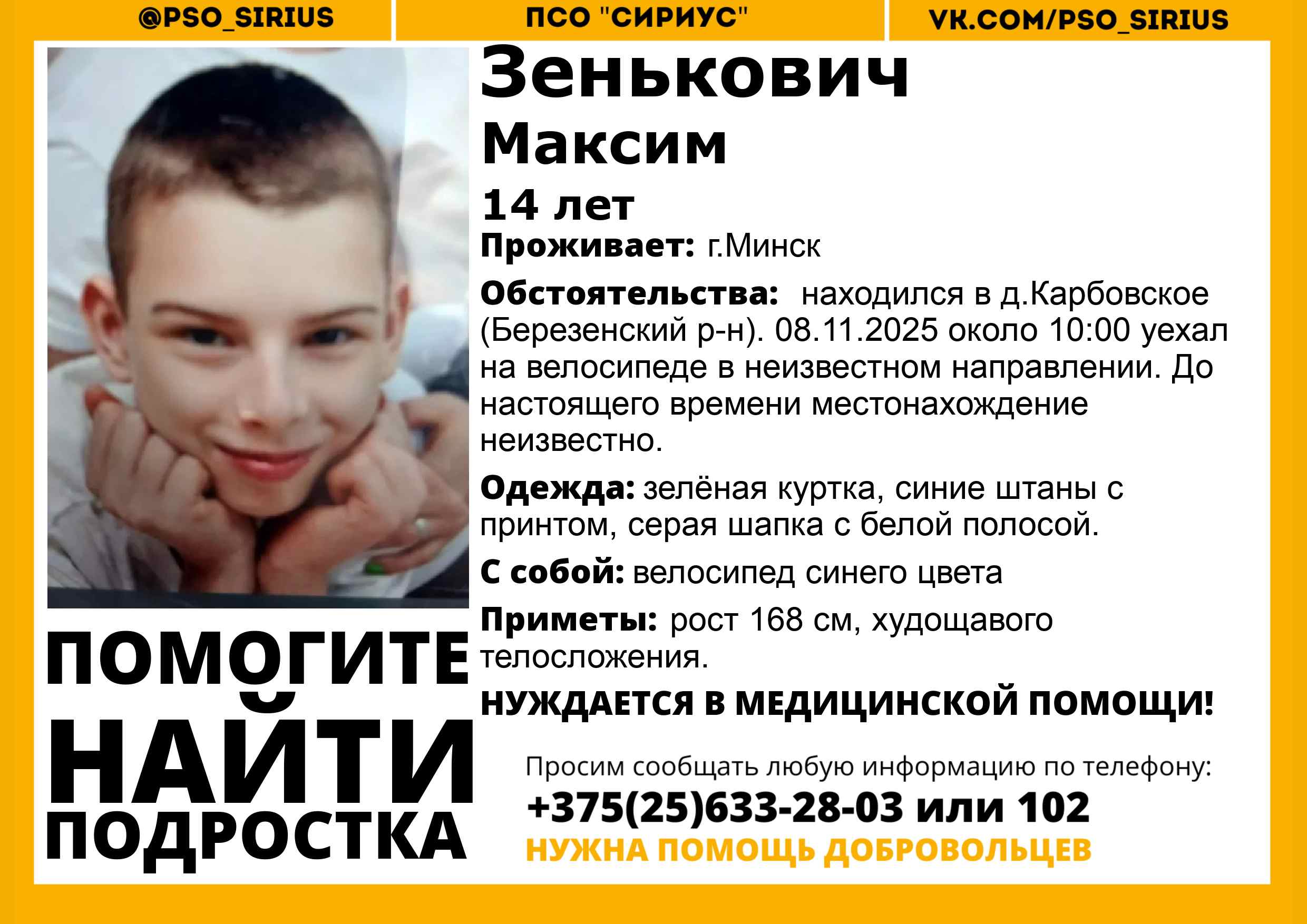 Всех, кто владеет информацией, просим сообщить: ПСО "Сириус" +375(25)633-28-03 |