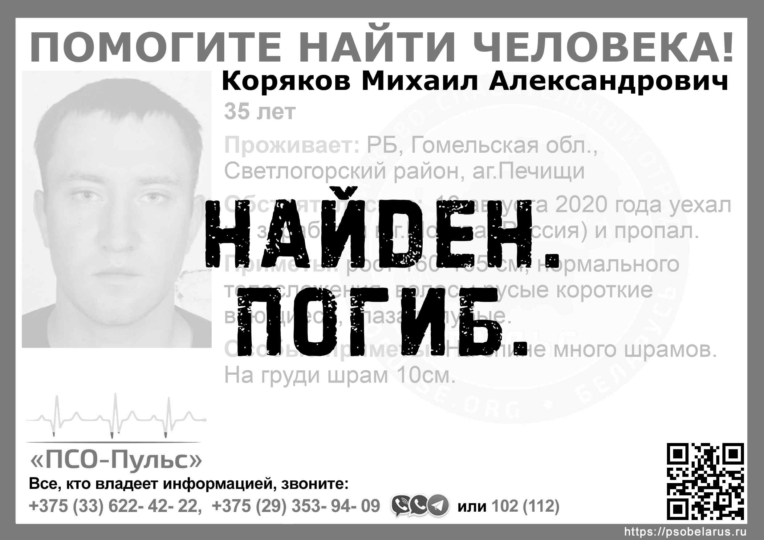Всех, кто владеет информацией, просим сообщить: ПСО "ПСО-Пульс" +375(33)622-4222 |