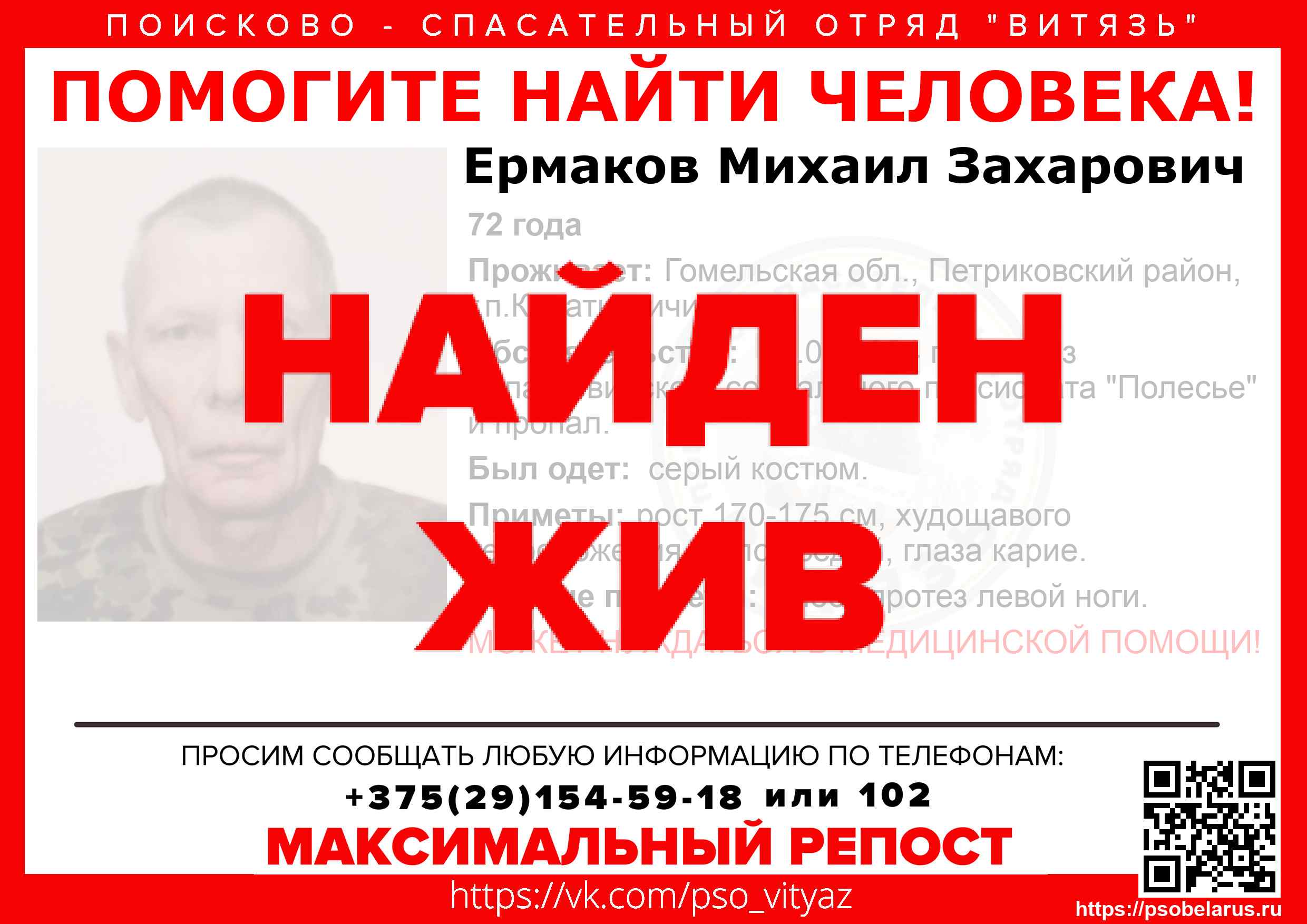 Всех, кто владеет информацией, просим сообщить: ПСО "ВИТЯЗЬ" +375(29)154-59-18 |