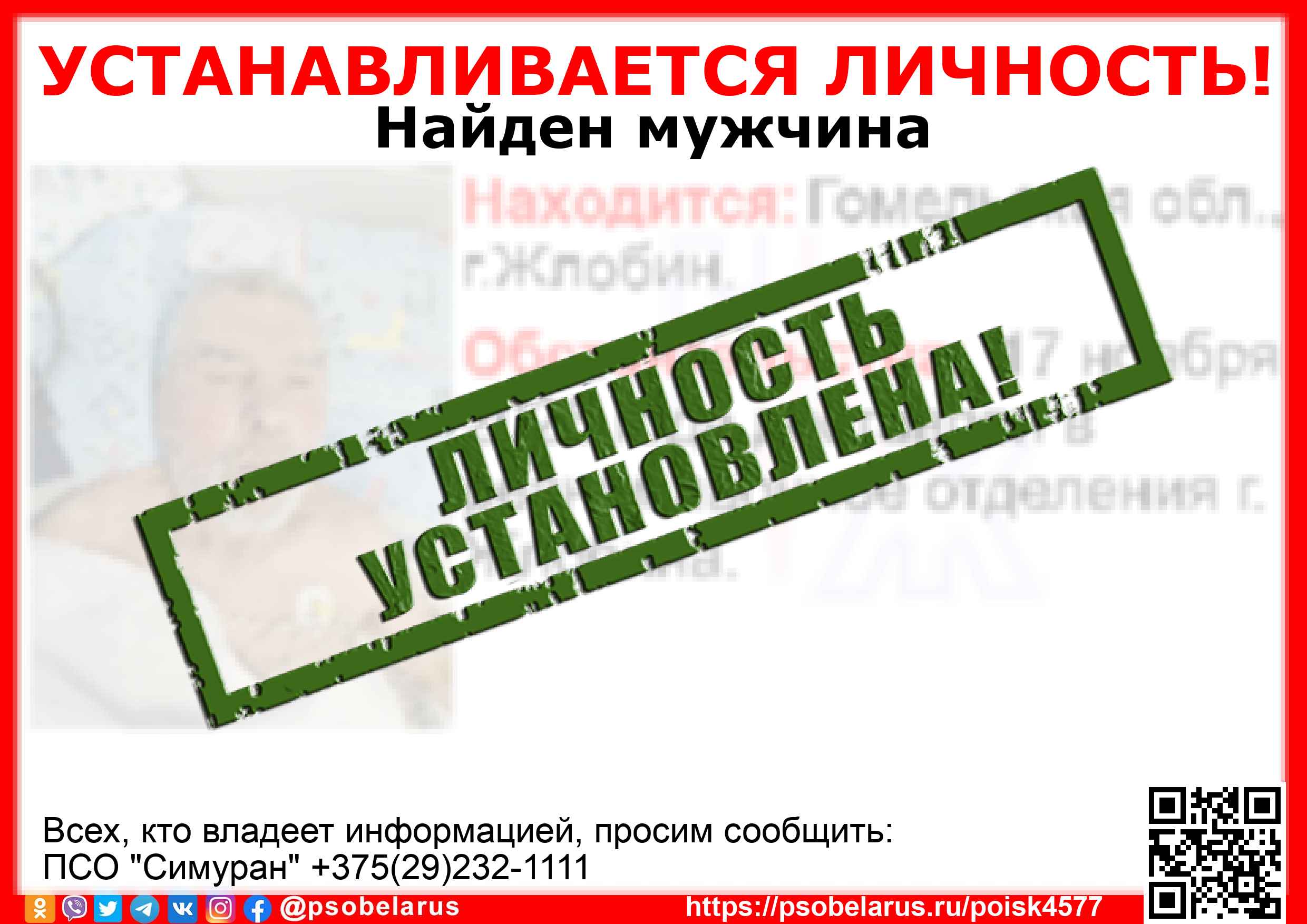 Всех, кто владеет информацией, просим сообщить: ПСО "Симуран" +375(29)232-1111 |