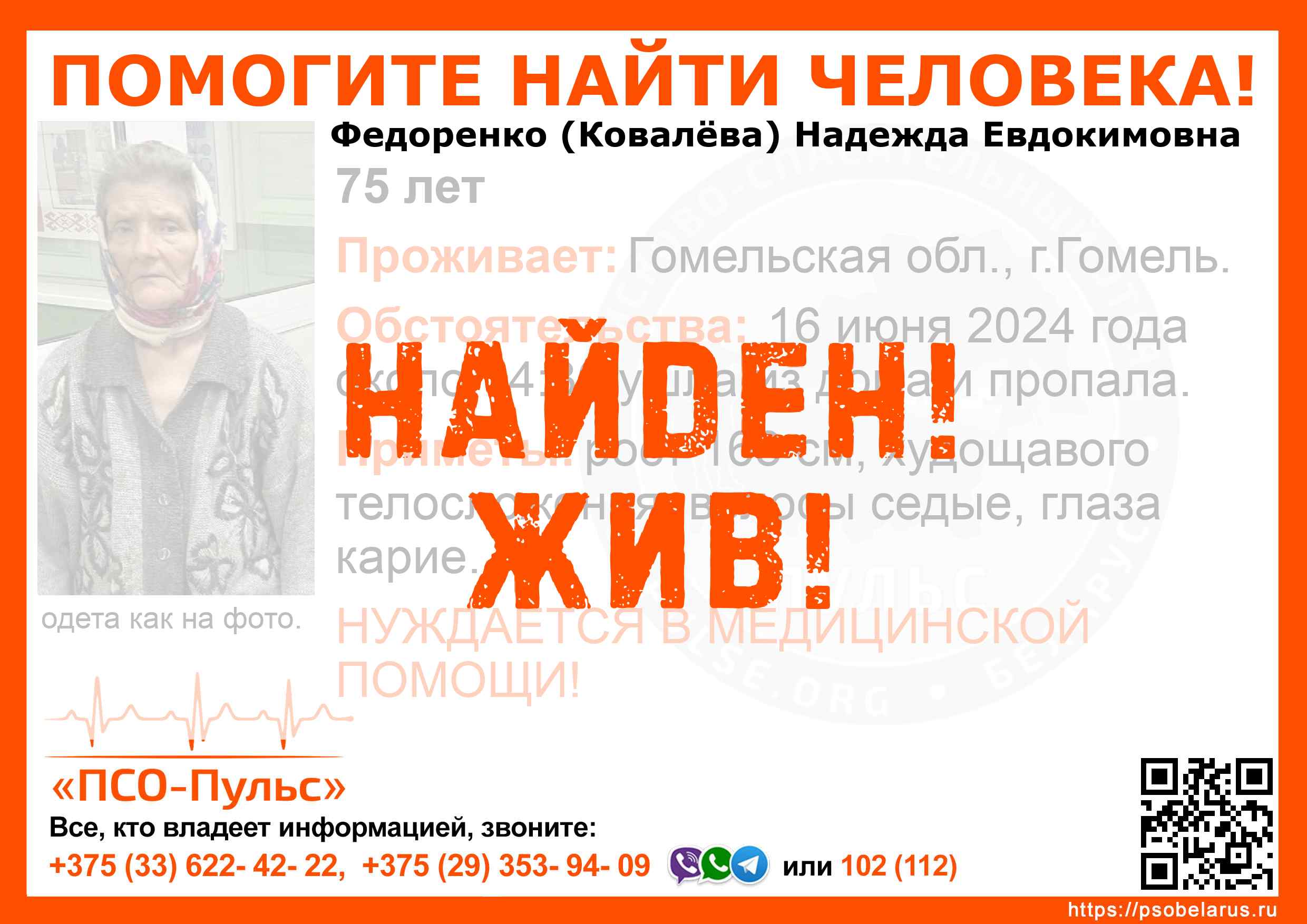 Всех, кто владеет информацией, просим сообщить: ПСО "ПСО-Пульс" +375(33)622-4222 |