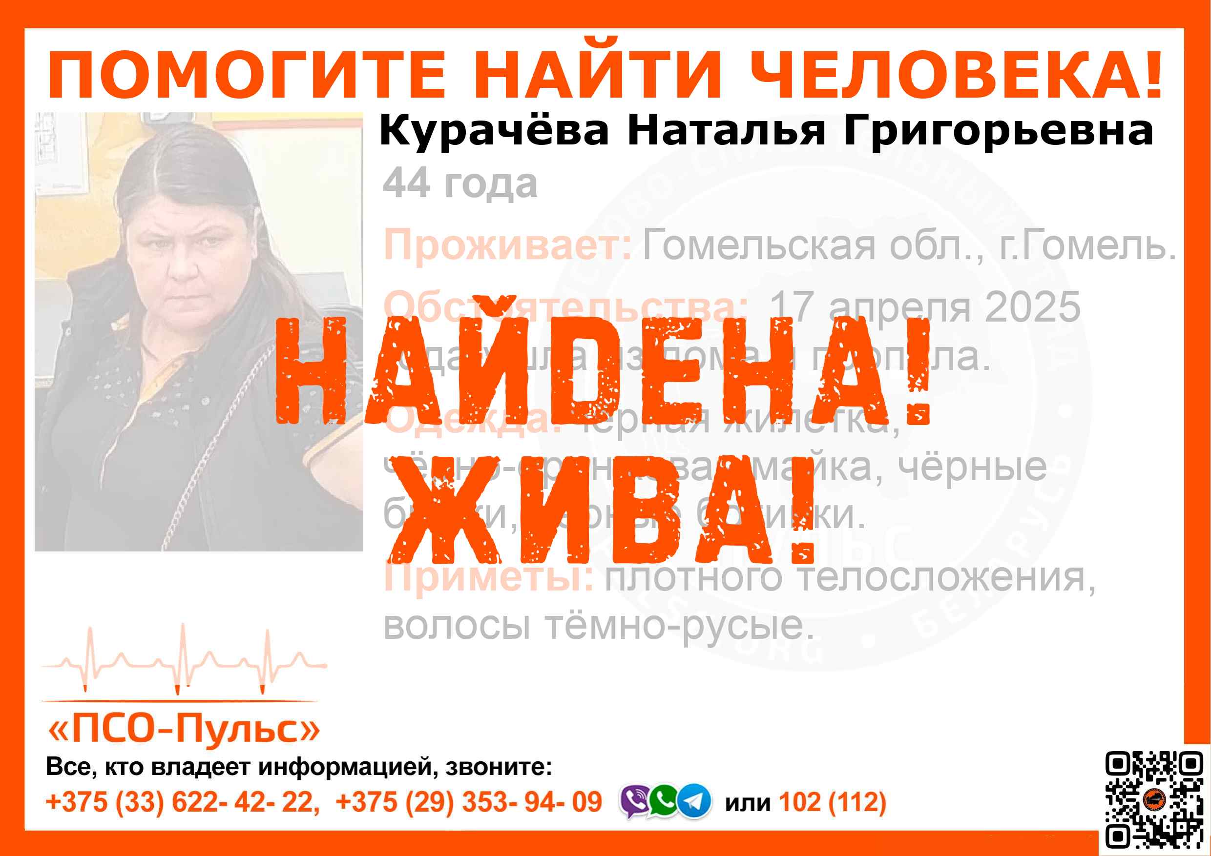 Всех, кто владеет информацией, просим сообщить: ПСО "ПСО-Пульс" +375(33)622-4222 |