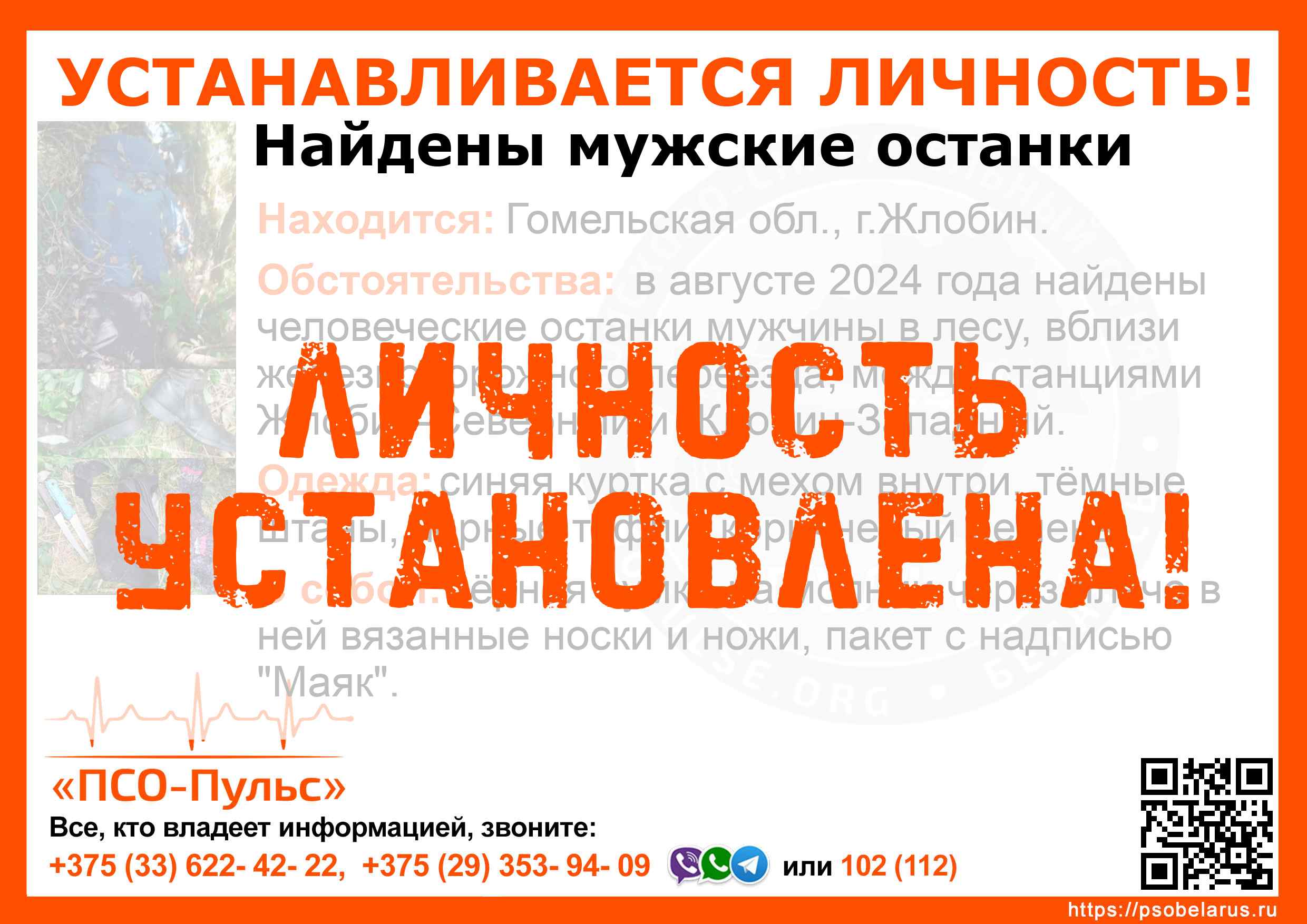 Всех, кто владеет информацией, просим сообщить: ПСО "ПСО-Пульс" +375(33)622-4222 |