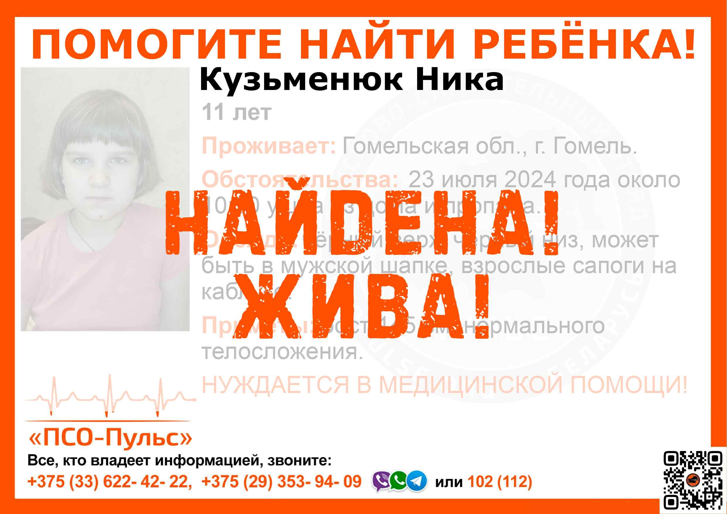 Всех, кто владеет информацией, просим сообщить: ПСО "ПСО-Пульс" +375(33)622-4222 |