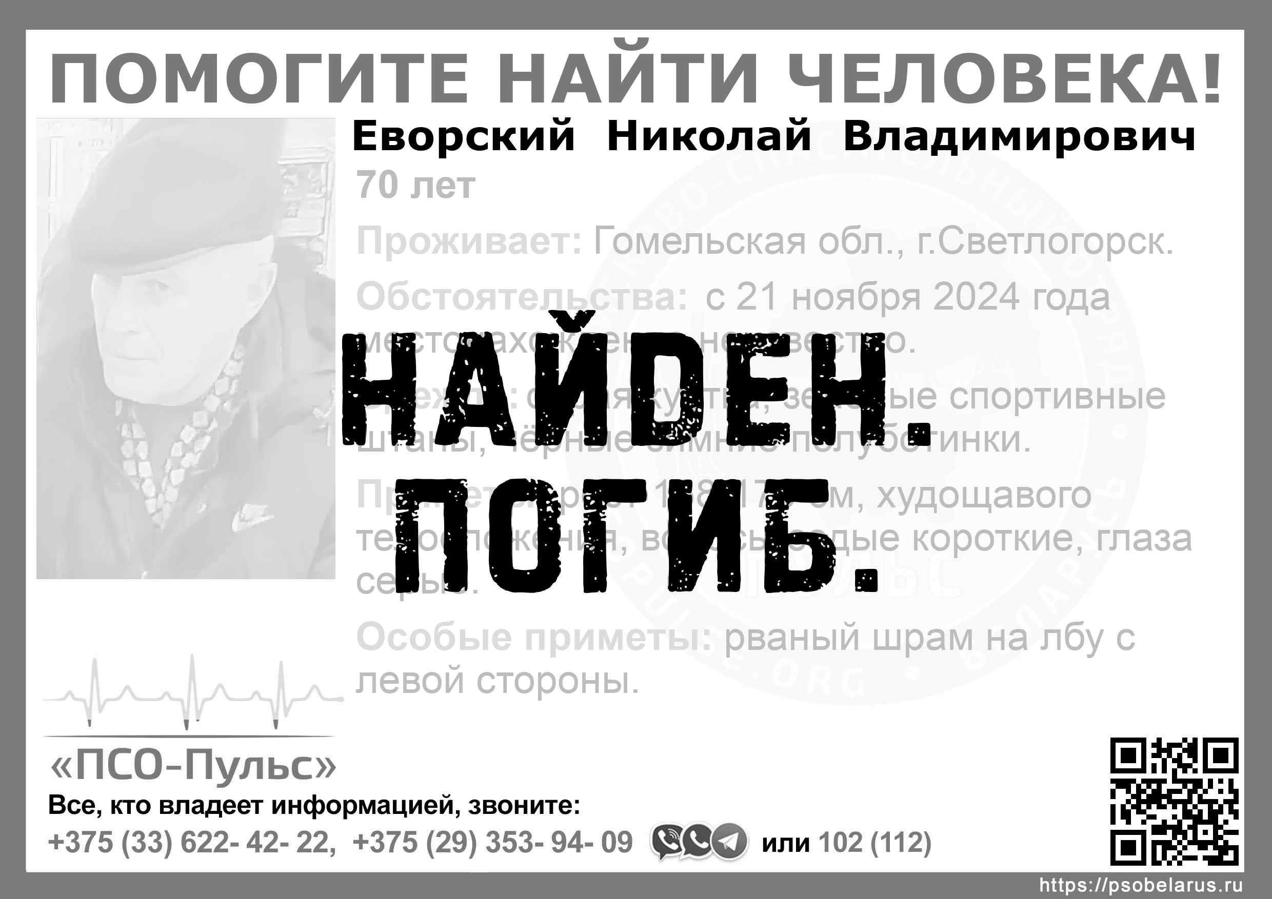 Всех, кто владеет информацией, просим сообщить: ПСО "ПСО-Пульс" +375(33)622-4222 |