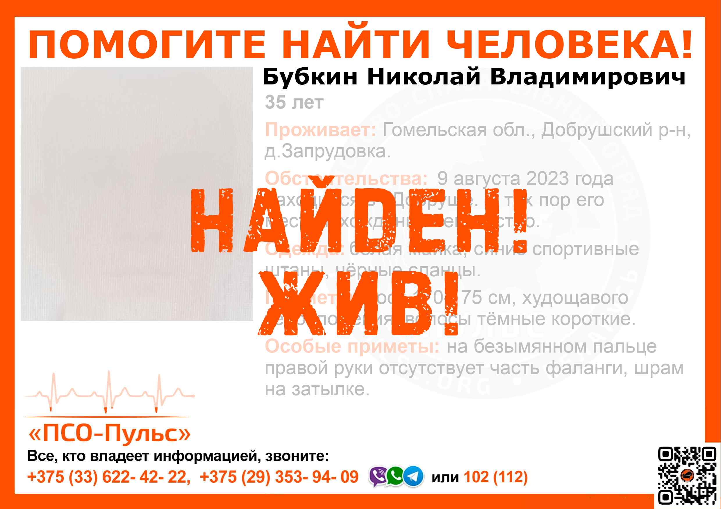 Всех, кто владеет информацией, просим сообщить: ПСО "ПСО-Пульс" +375(33)622-4222 |