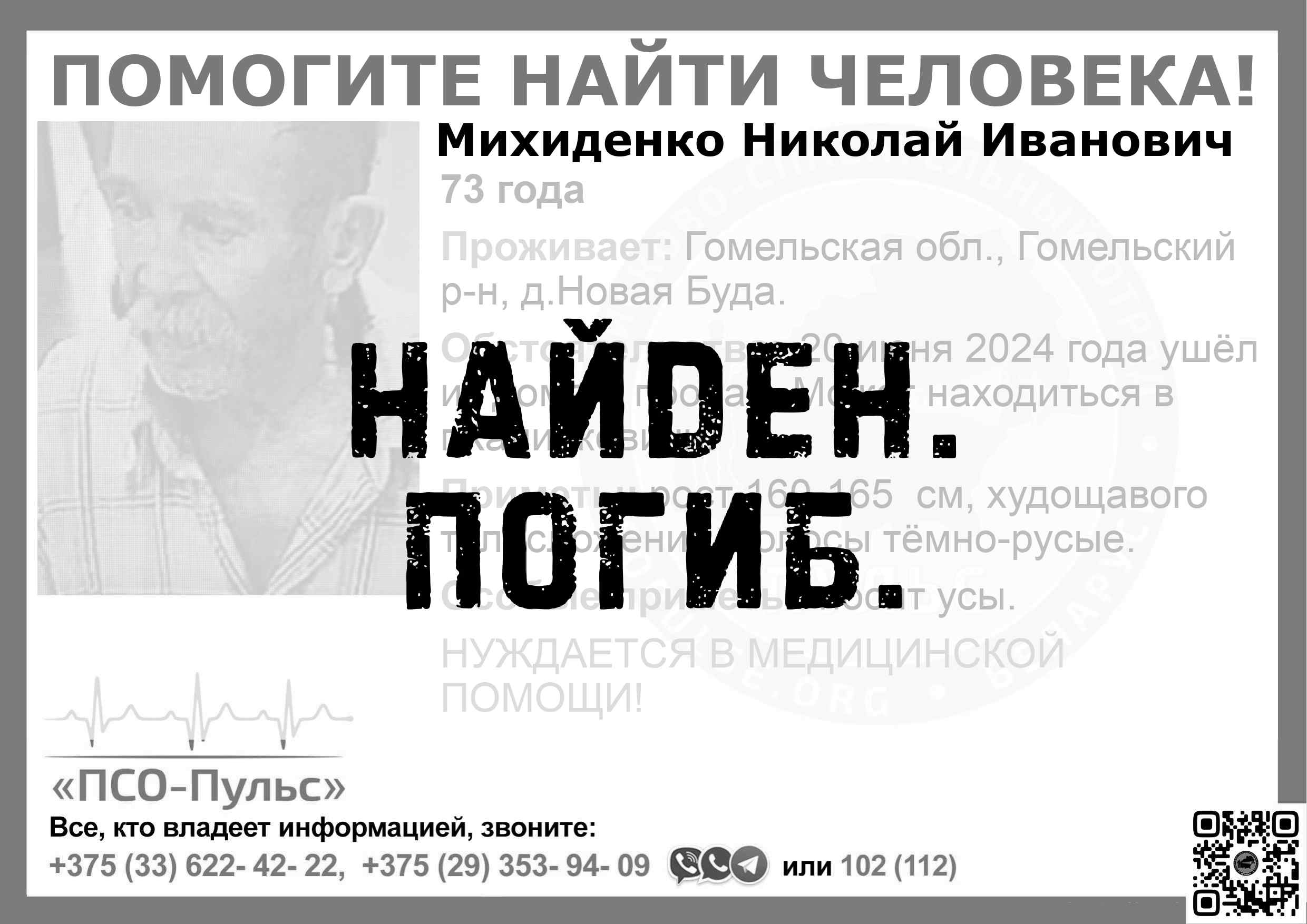 Всех, кто владеет информацией, просим сообщить: ПСО "ПСО-Пульс" +375(33)622-4222 |