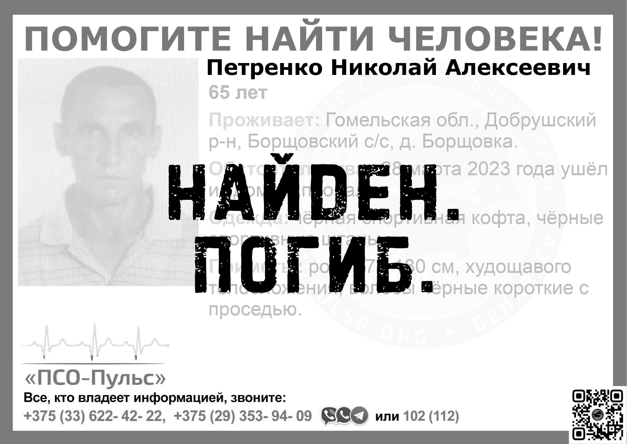 Всех, кто владеет информацией, просим сообщить: ПСО "ПСО-Пульс" +375(33)622-4222 |