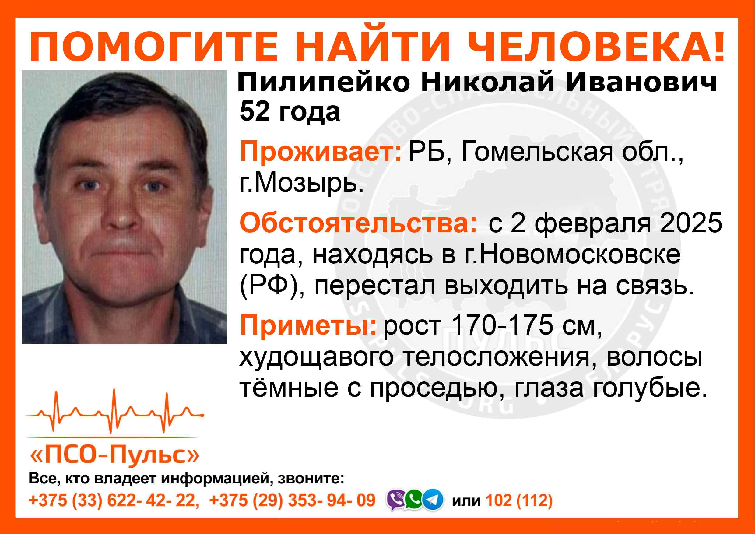 Всех, кто владеет информацией, просим сообщить: ПСО "ПСО-Пульс" +375(33)622-4222 |