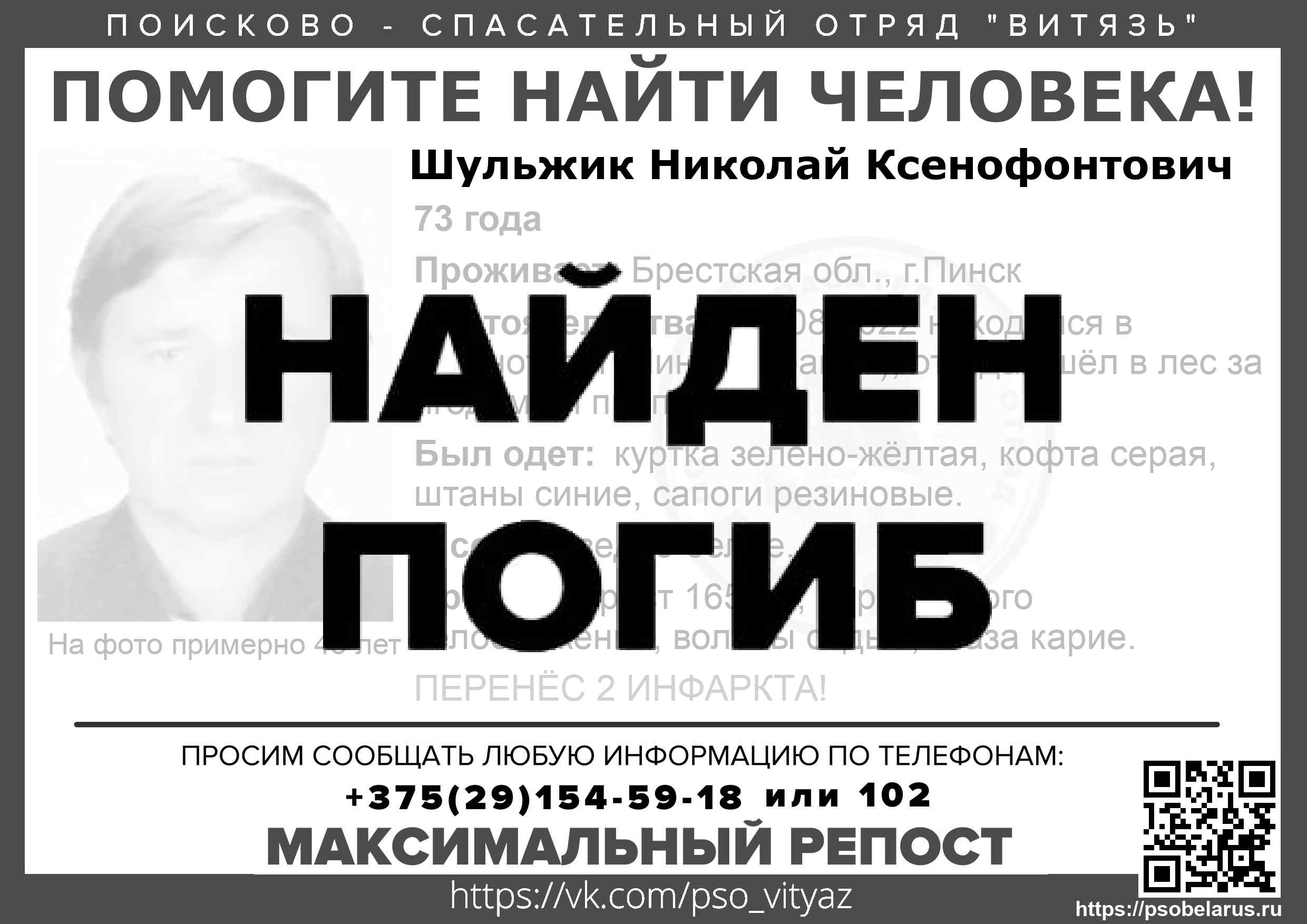 Напомним, Шульжик Николай Ксенфонтович пропал 20.08, ушел в лес за ягодами. До настоящего времени его местонахождение неизвестно.