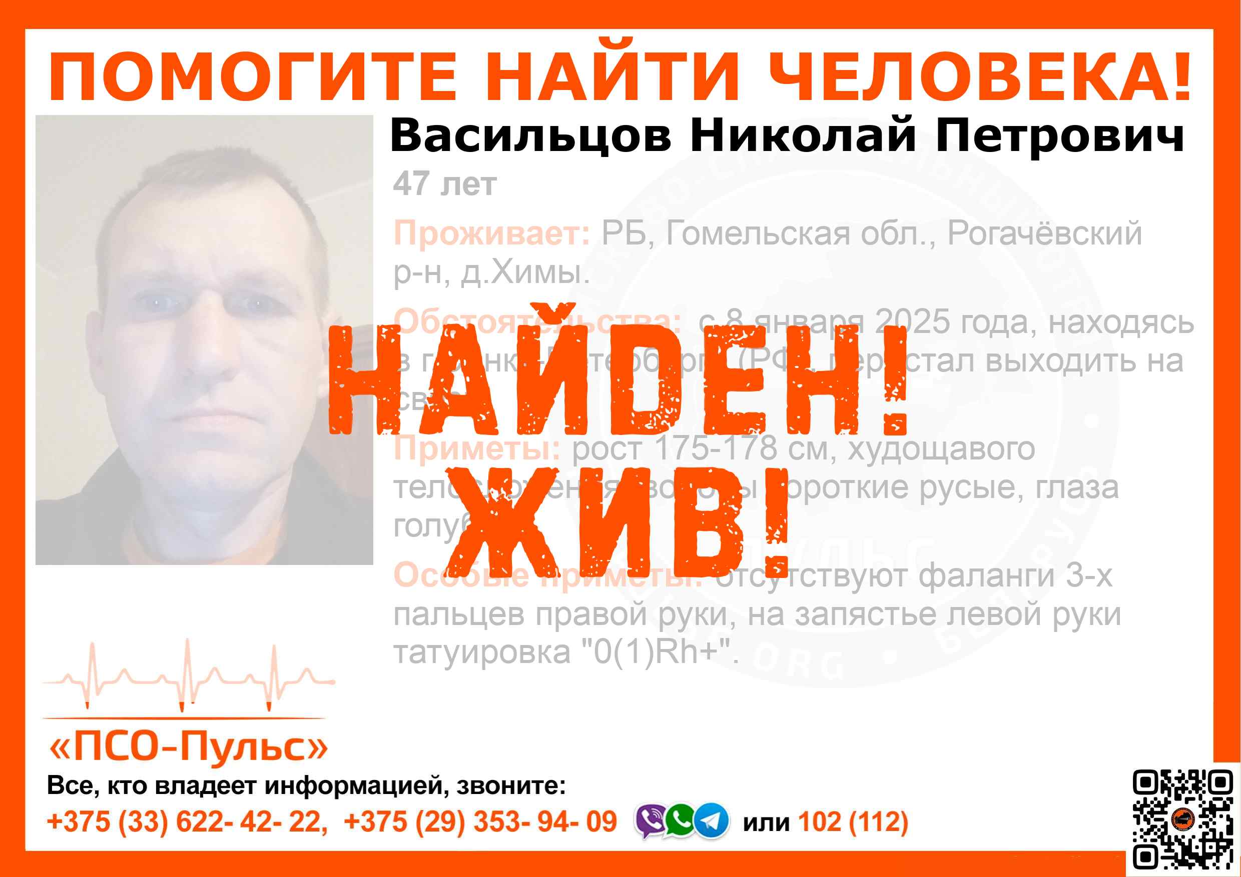 Всех, кто владеет информацией, просим сообщить: ПСО "ПСО-Пульс" +375(33)622-4222 |