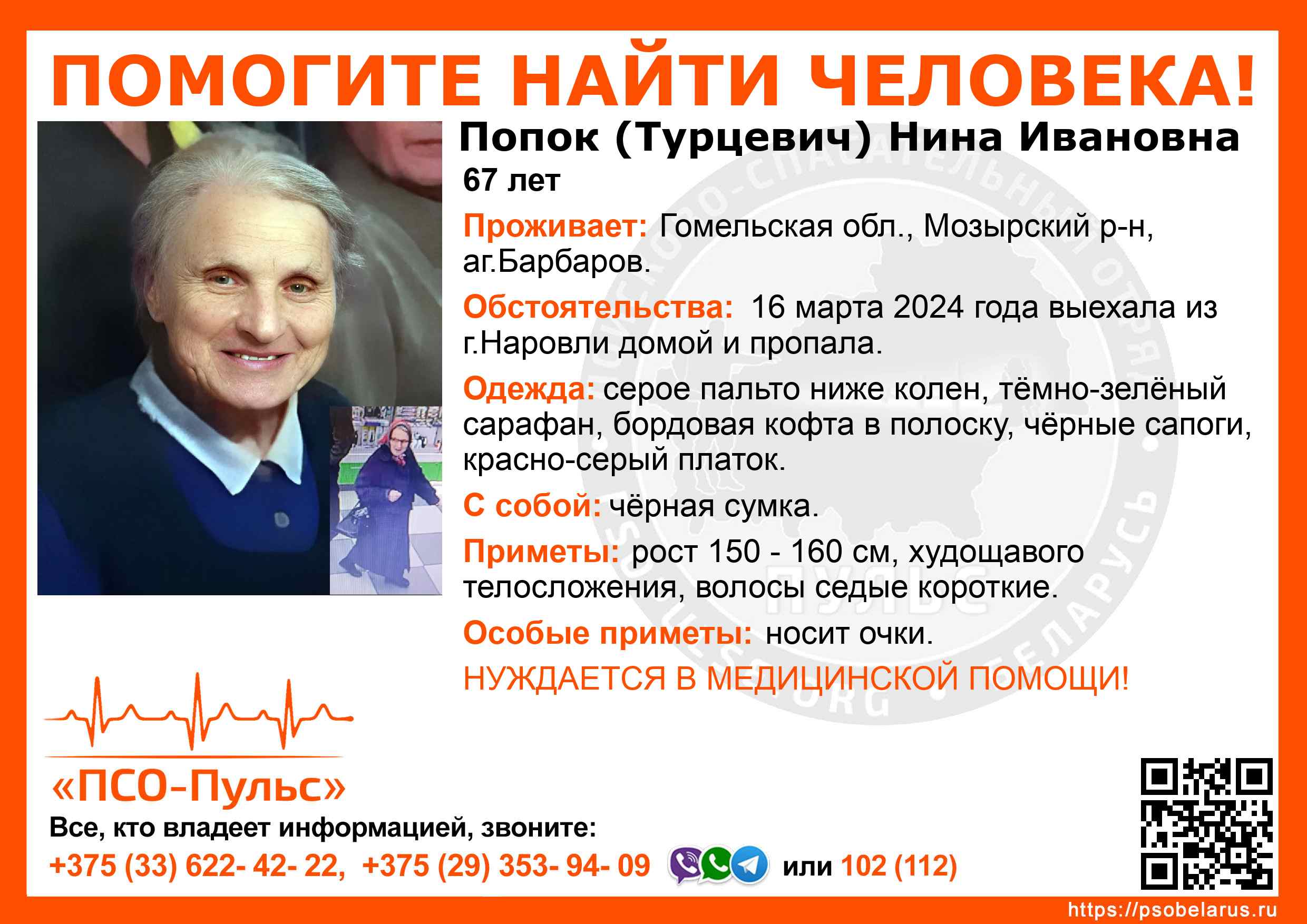 Всех, кто владеет информацией, просим сообщить: ПСО "ПСО-Пульс" +375(33)622-4222 |