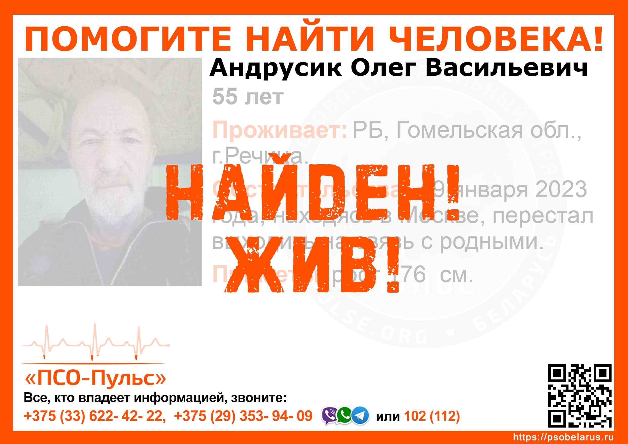 Всех, кто владеет информацией, просим сообщить: ПСО "ПСО-Пульс" +375(33)622-4222 |