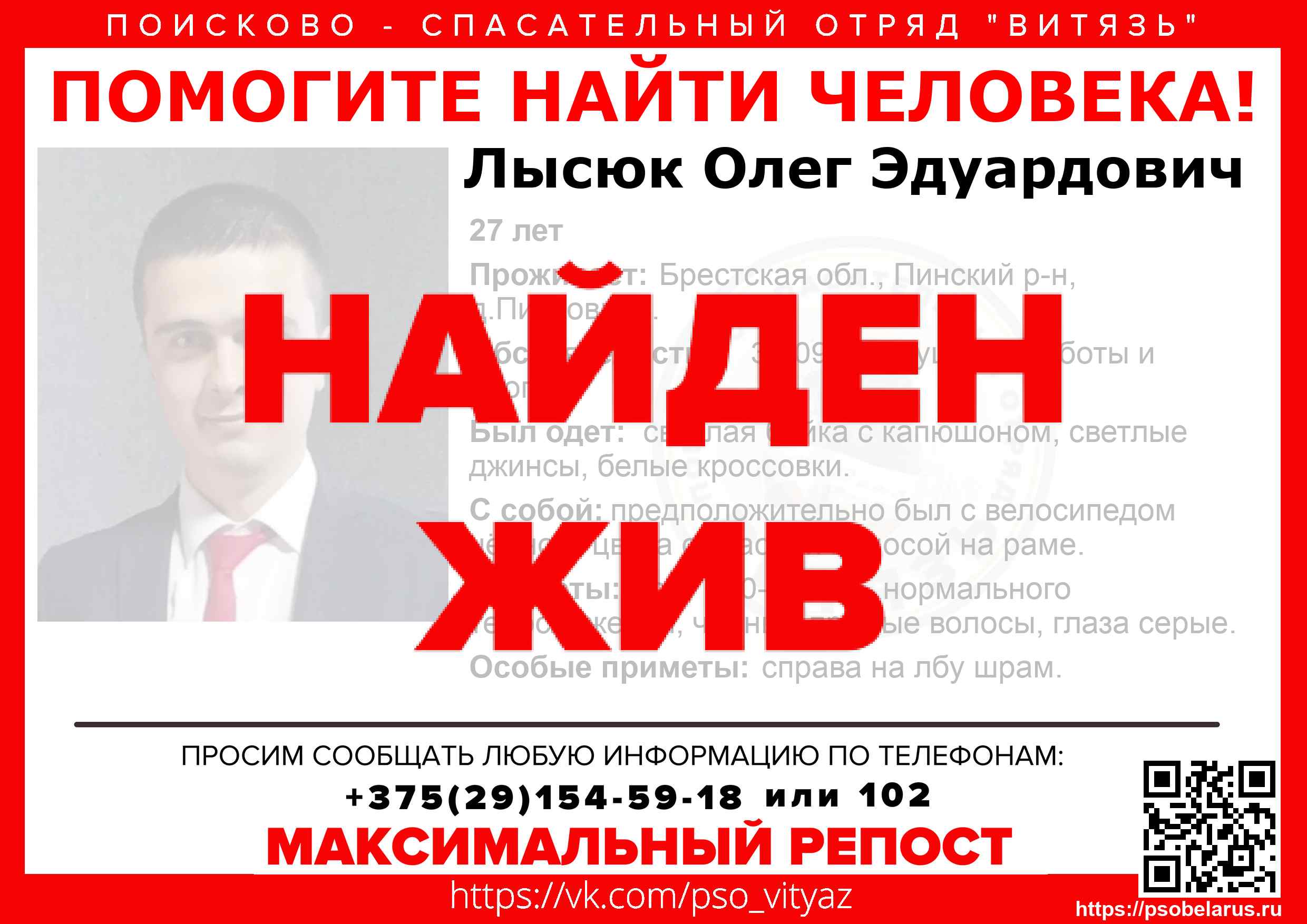 Всех, кто владеет информацией, просим сообщить: ПСО "ВИТЯЗЬ" +375(29)154-59-18 |