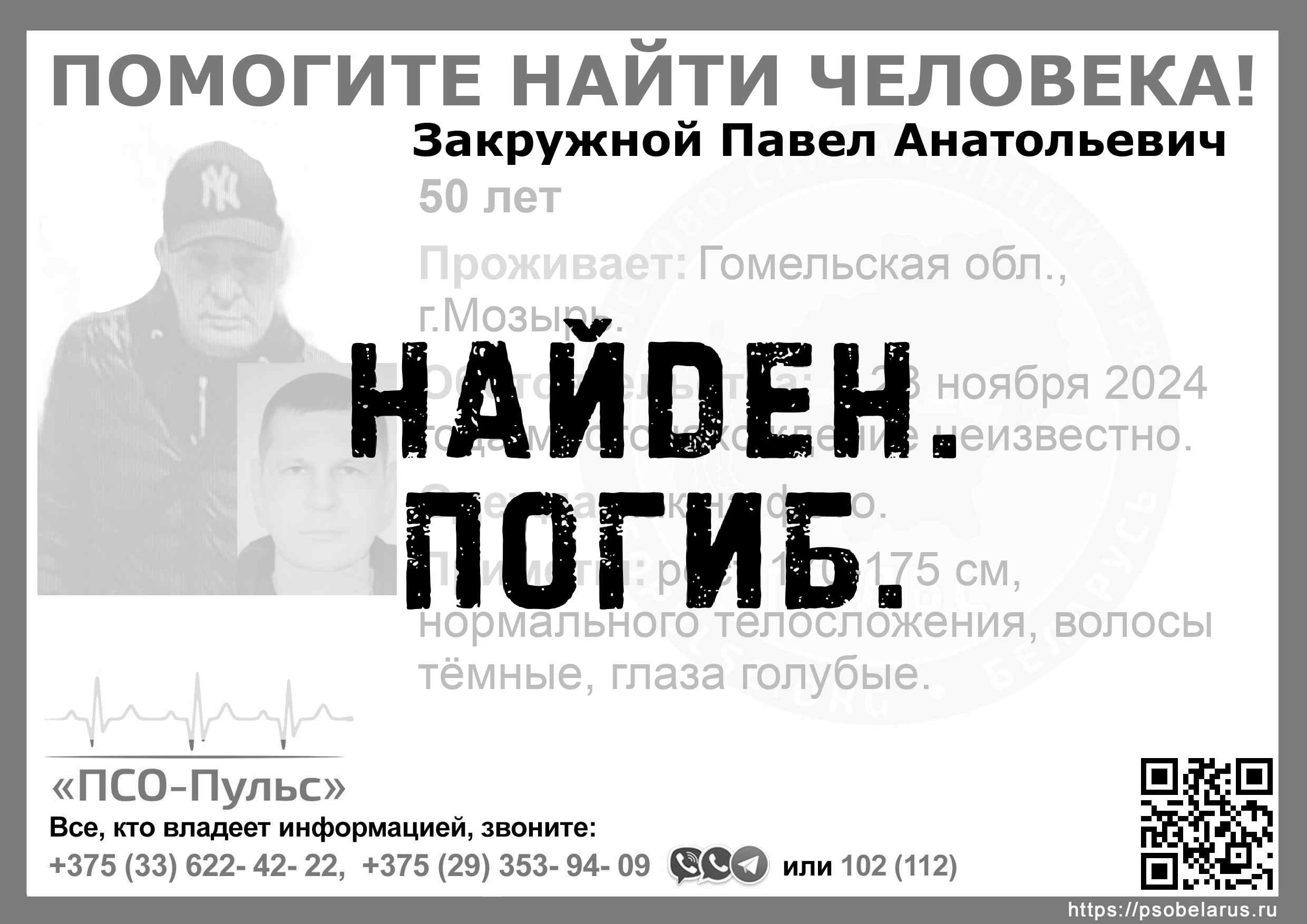 Всех, кто владеет информацией, просим сообщить: ПСО "ПСО-Пульс" +375(33)622-4222 |