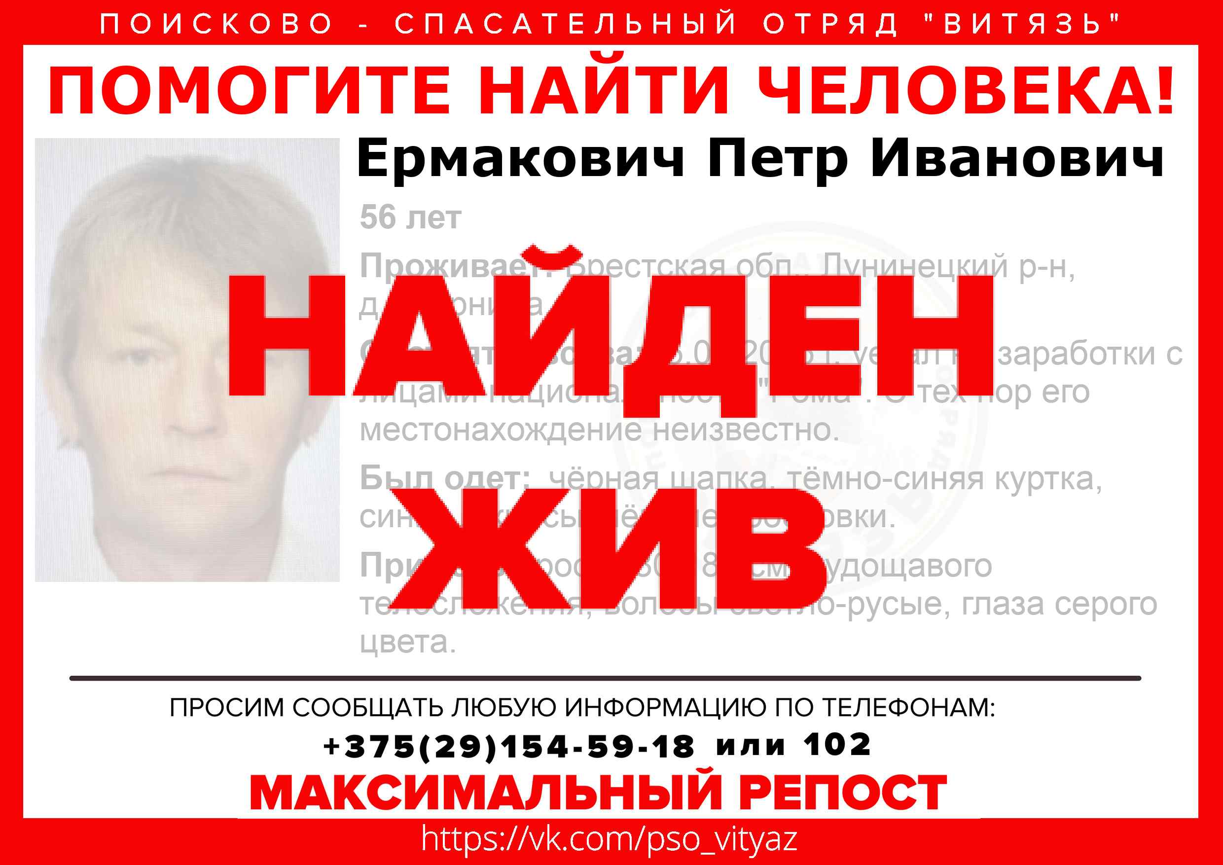 Всех, кто владеет информацией, просим сообщить: ПСО "ВИТЯЗЬ" +375(29)154-59-18 |