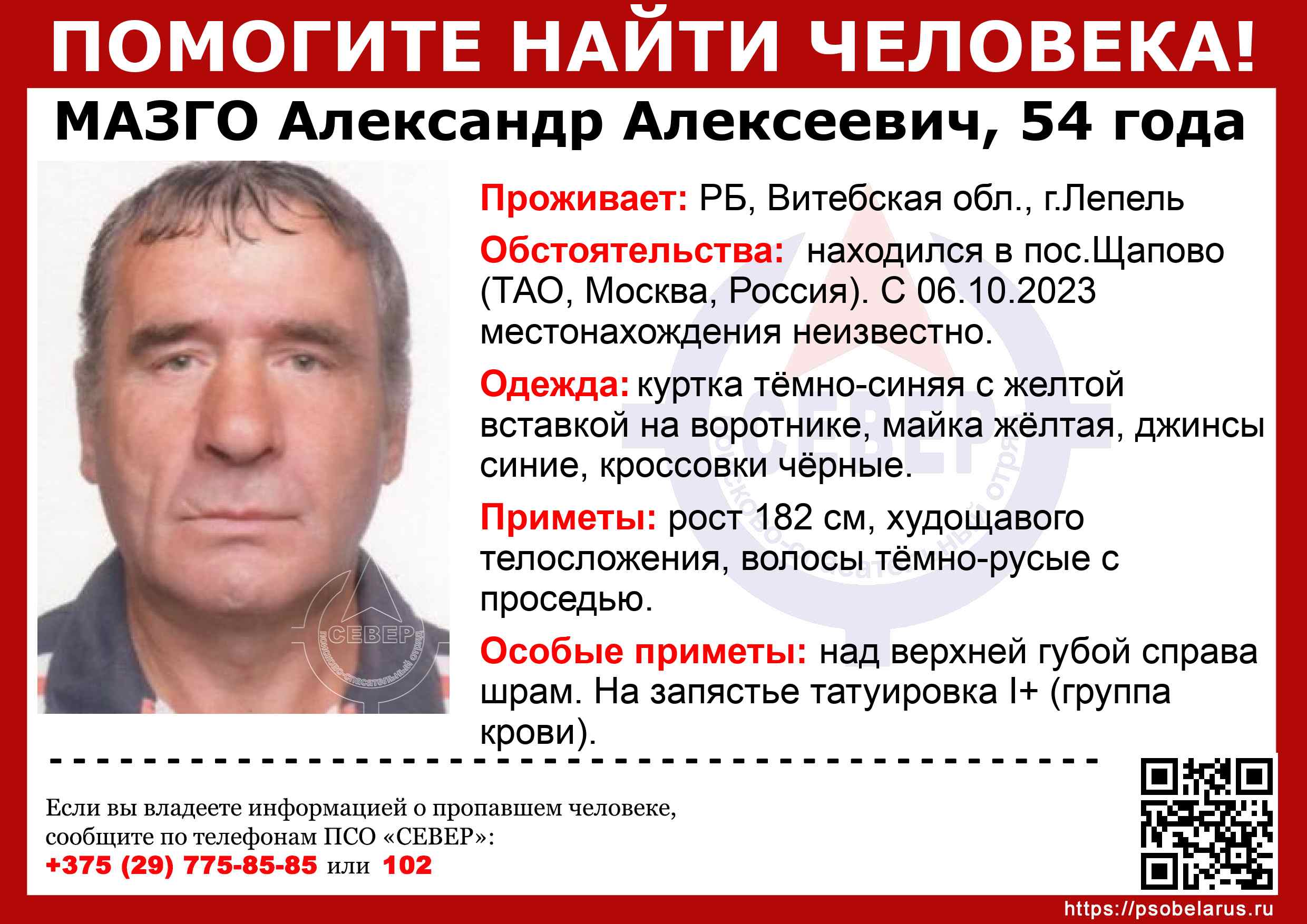Всех, кто владеет информацией, просим сообщить: ПСО "СЕВЕР" +375(29)775-8585 |
