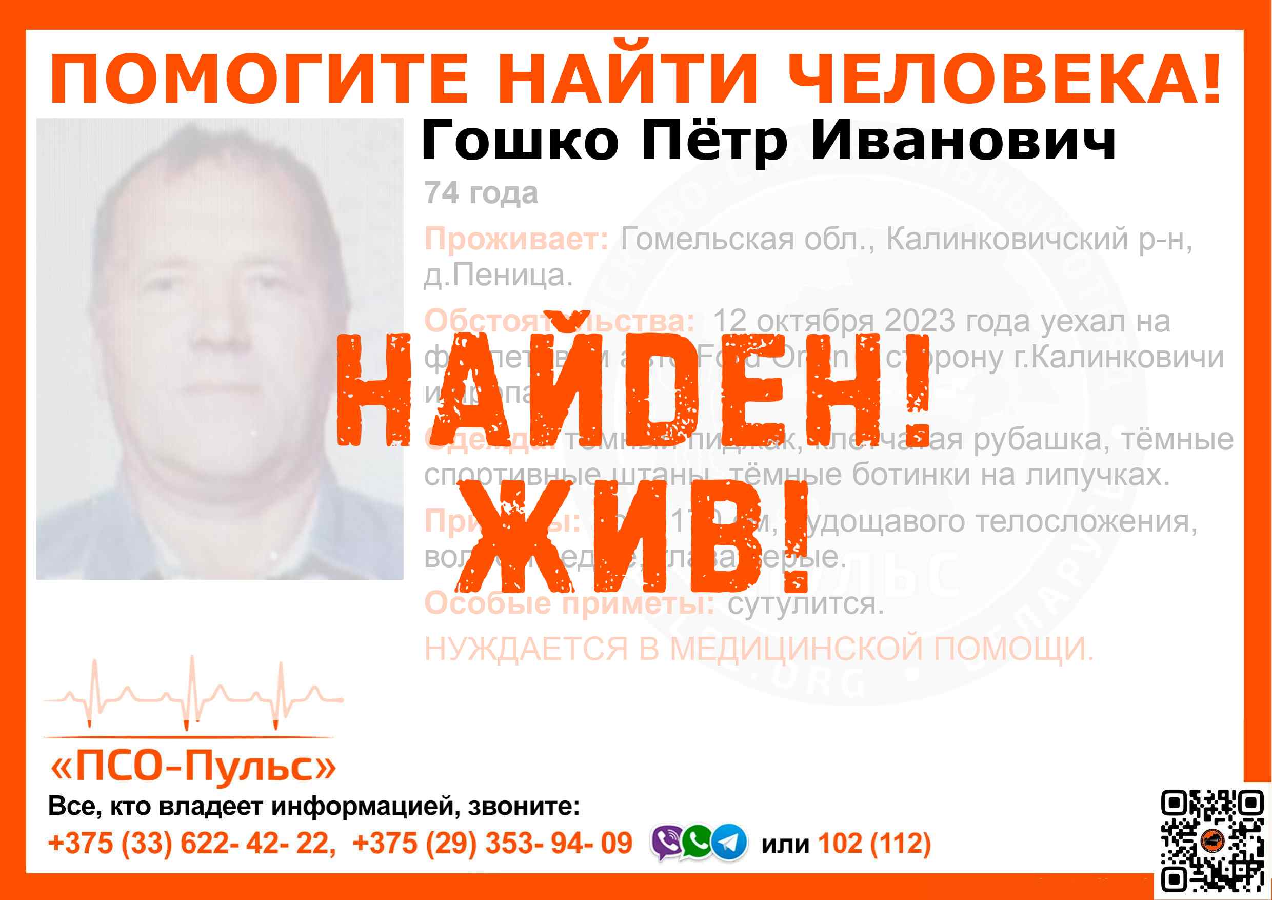 Всех, кто владеет информацией, просим сообщить: ПСО "ПСО-Пульс" +375(33)622-4222 |