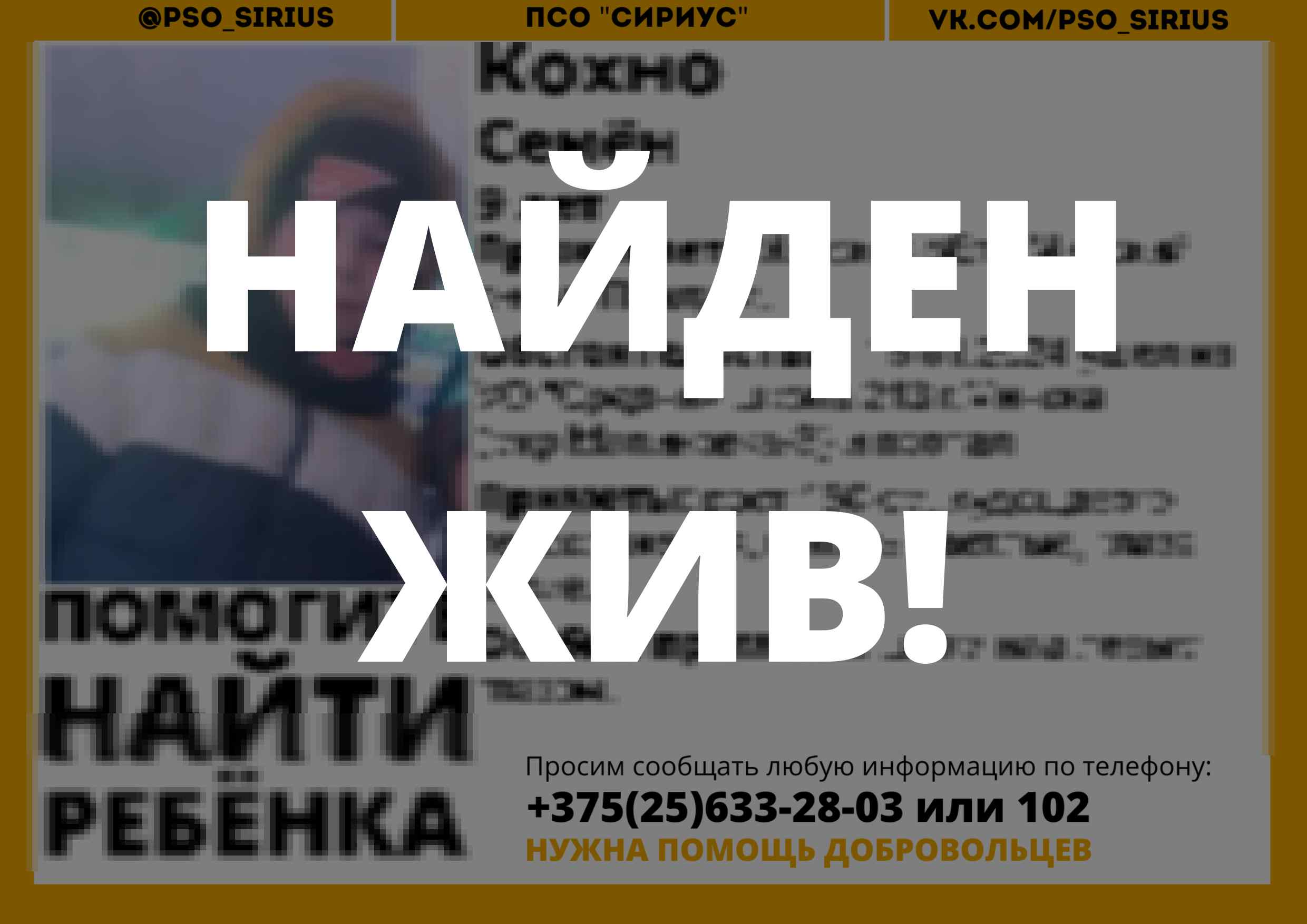 Всех, кто владеет информацией, просим сообщить: ПСО "Сириус" +375(25)633-28-03 |