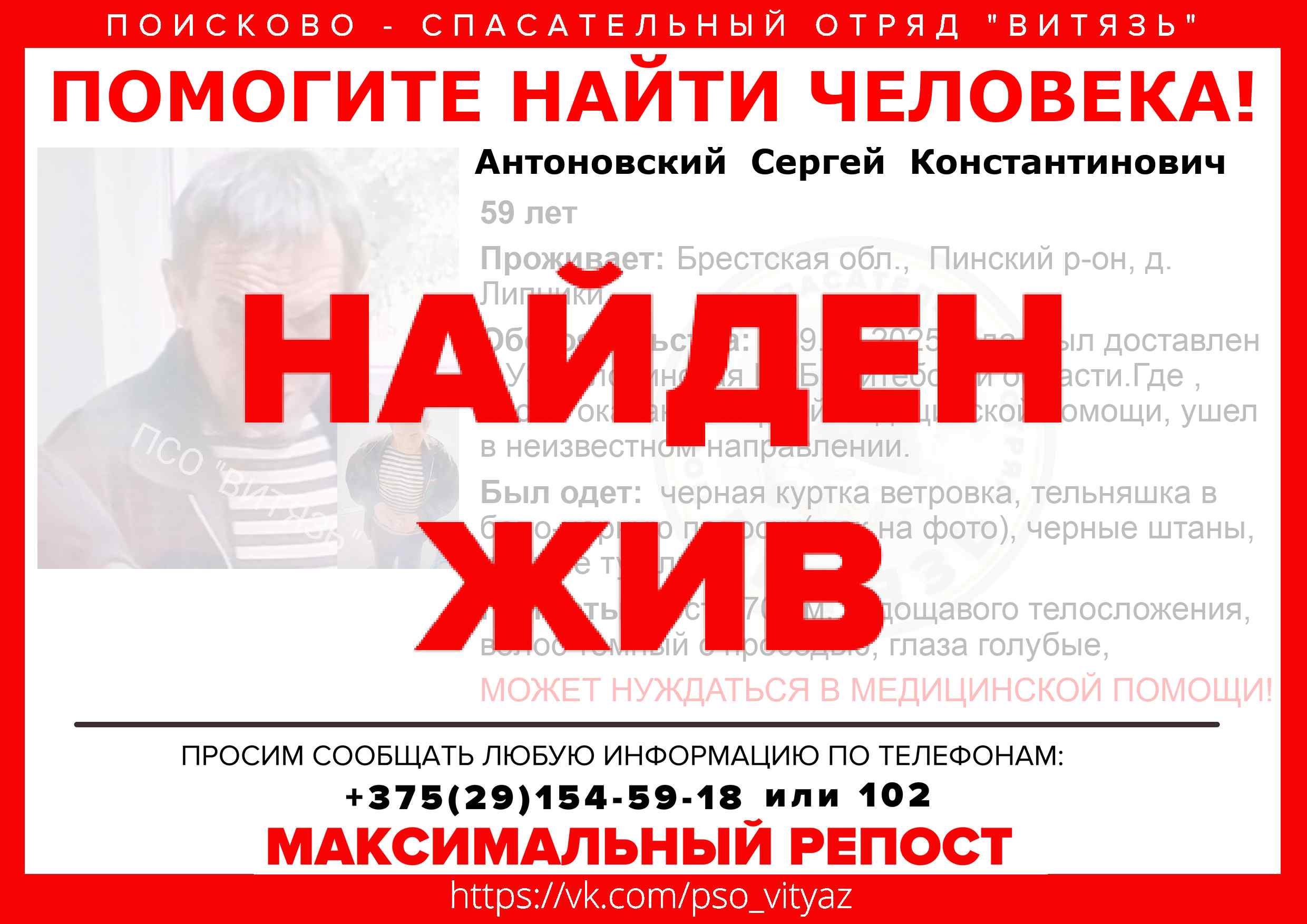 Всех, кто владеет информацией, просим сообщить: ПСО "ВИТЯЗЬ" +375(29)154-59-18 |