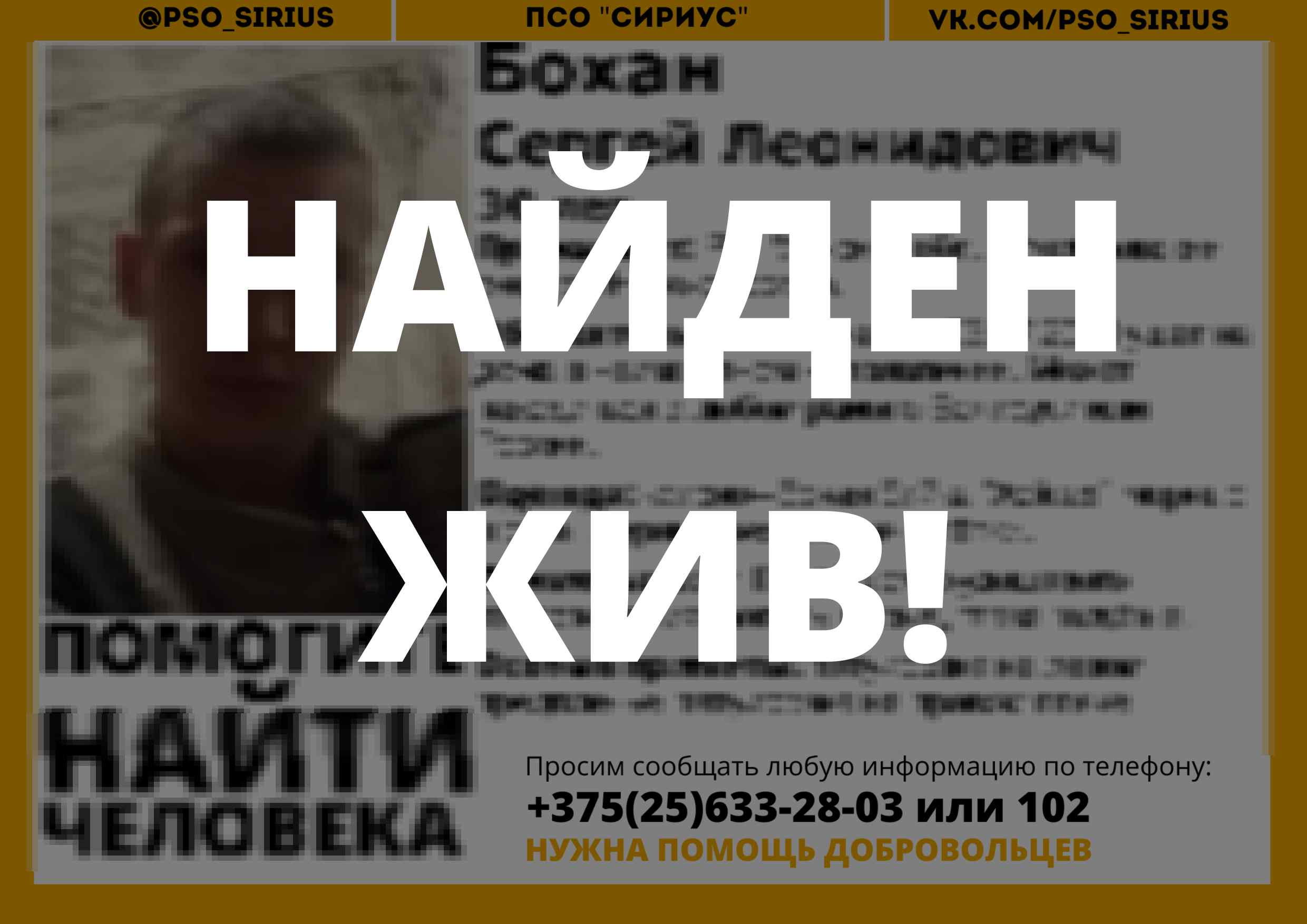 Всех, кто владеет информацией, просим сообщить: ПСО "Сириус" +375(25)633-28-03 |