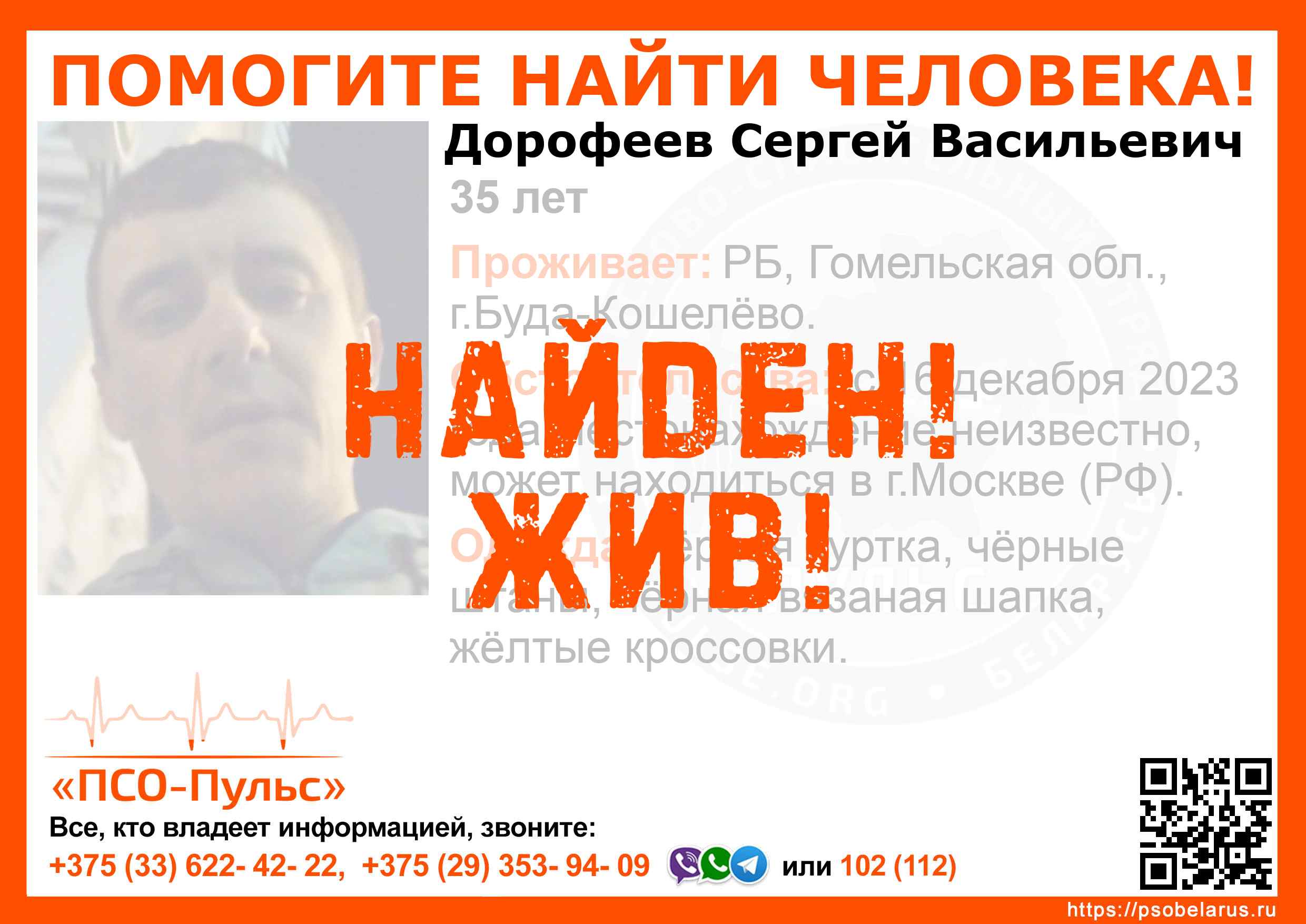 Всех, кто владеет информацией, просим сообщить: ПСО "ПСО-Пульс" +375(33)622-4222 |