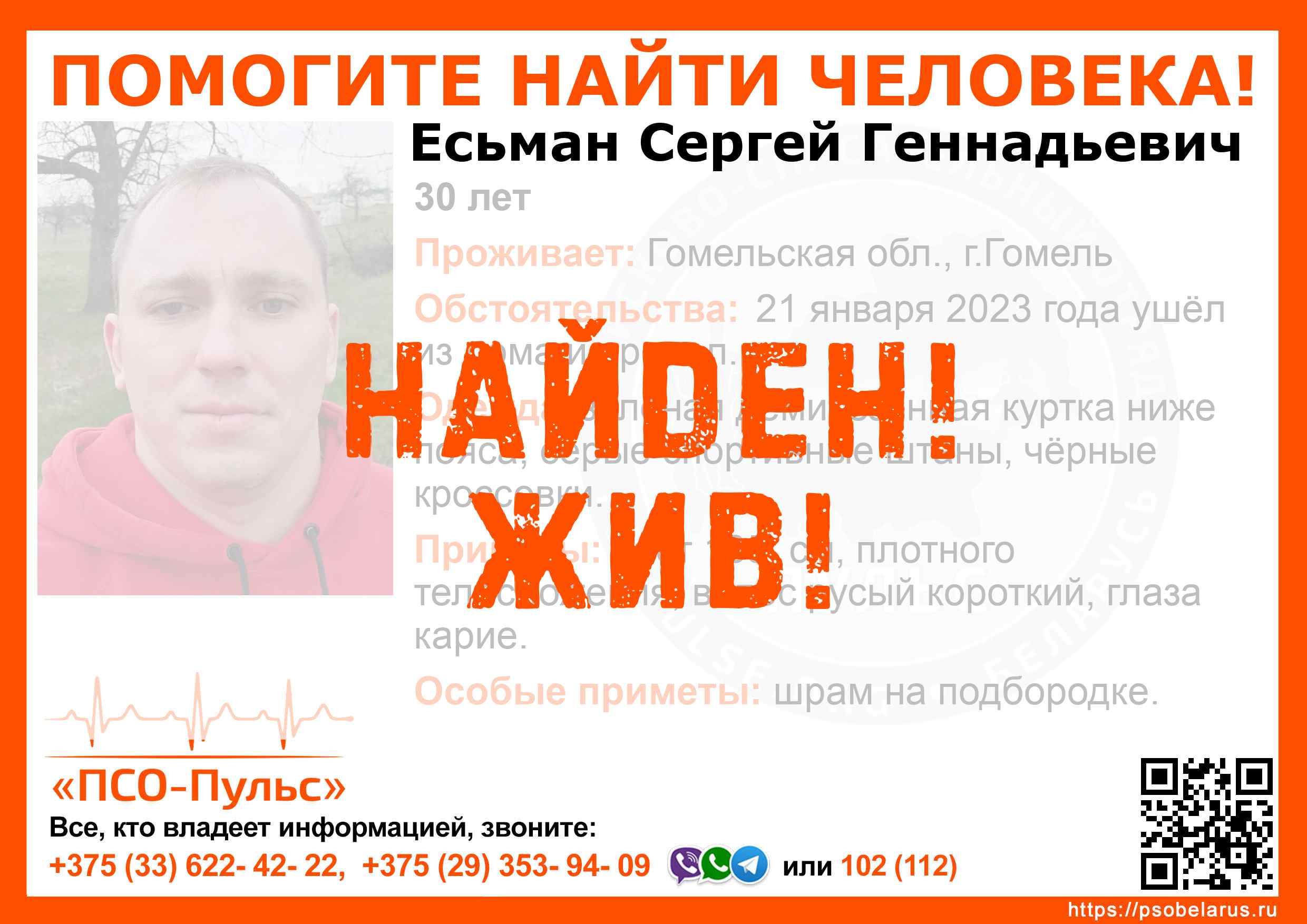 Всех, кто владеет информацией, просим сообщить: ПСО "ПСО-Пульс" +375(33)622-4222 |