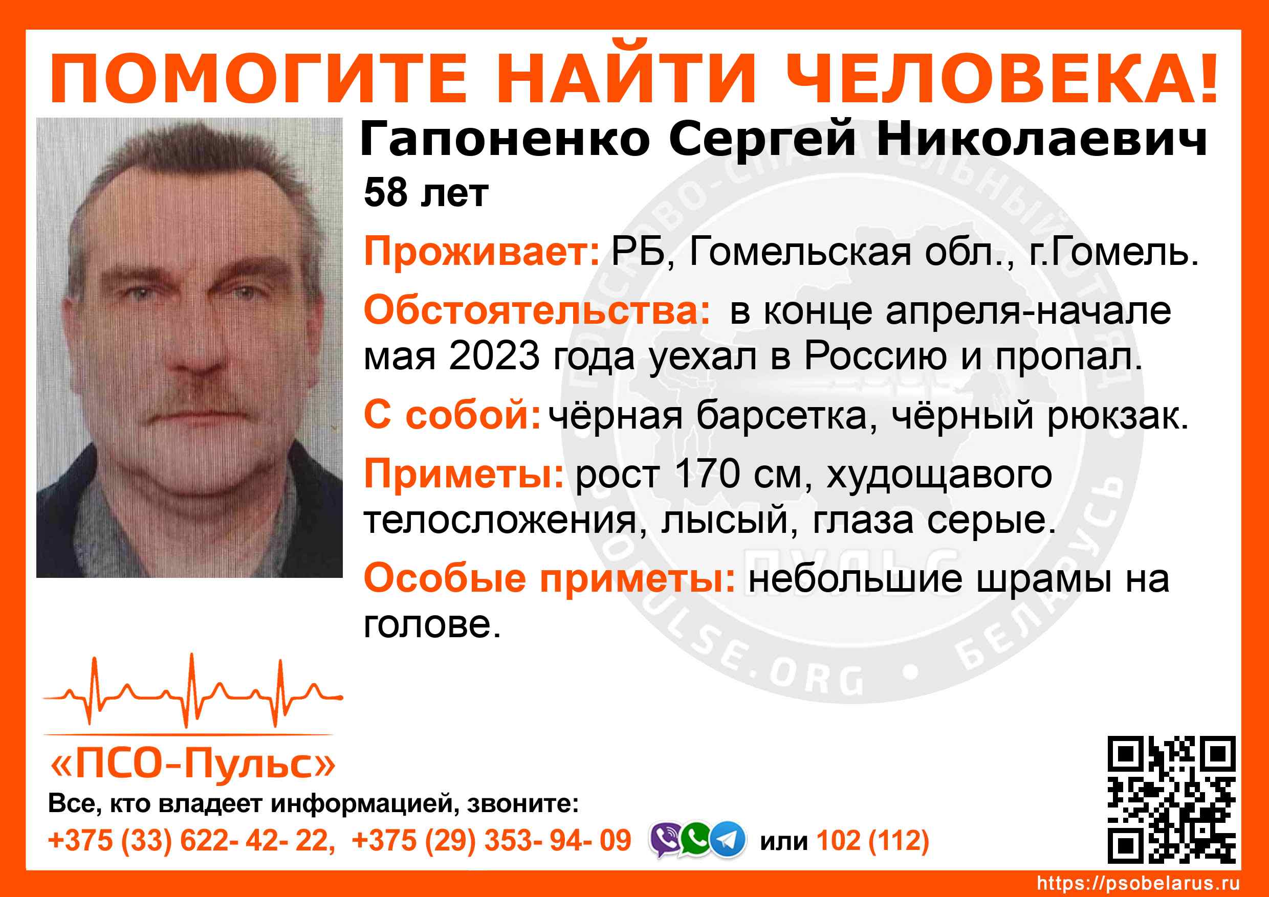 Всех, кто владеет информацией, просим сообщить: ПСО "ПСО-Пульс" +375(33)622-4222 |
