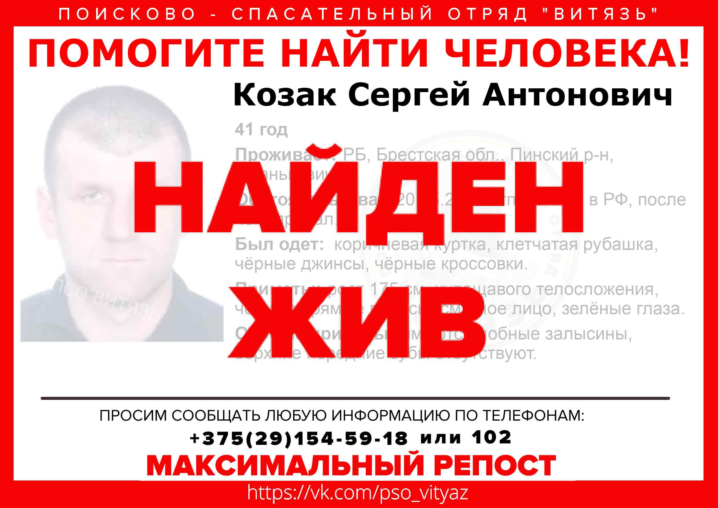 Всех, кто владеет информацией, просим сообщить: ПСО "ВИТЯЗЬ" +375(29)154-59-18 |