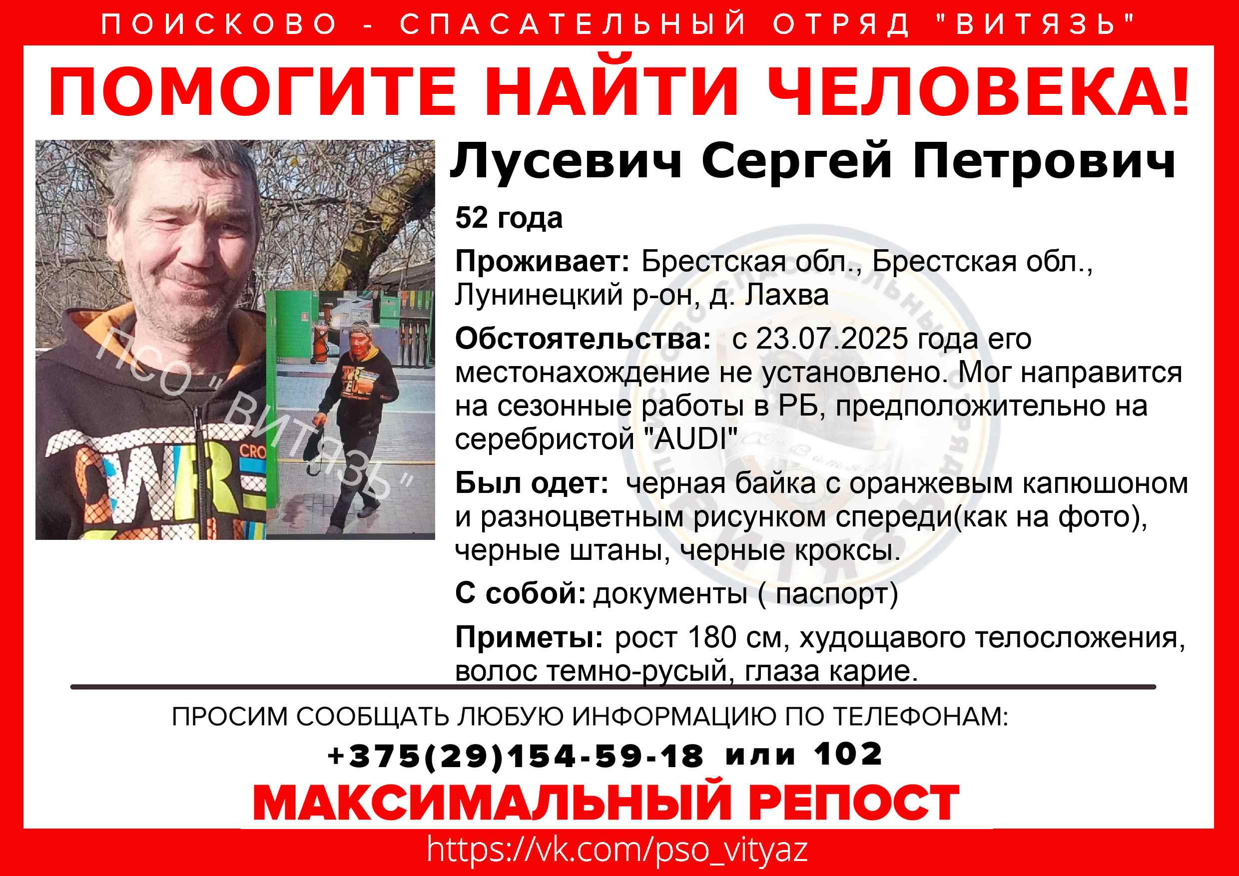 Всех, кто владеет информацией, просим сообщить: ПСО "ВИТЯЗЬ" +375(29)154-59-18 |
