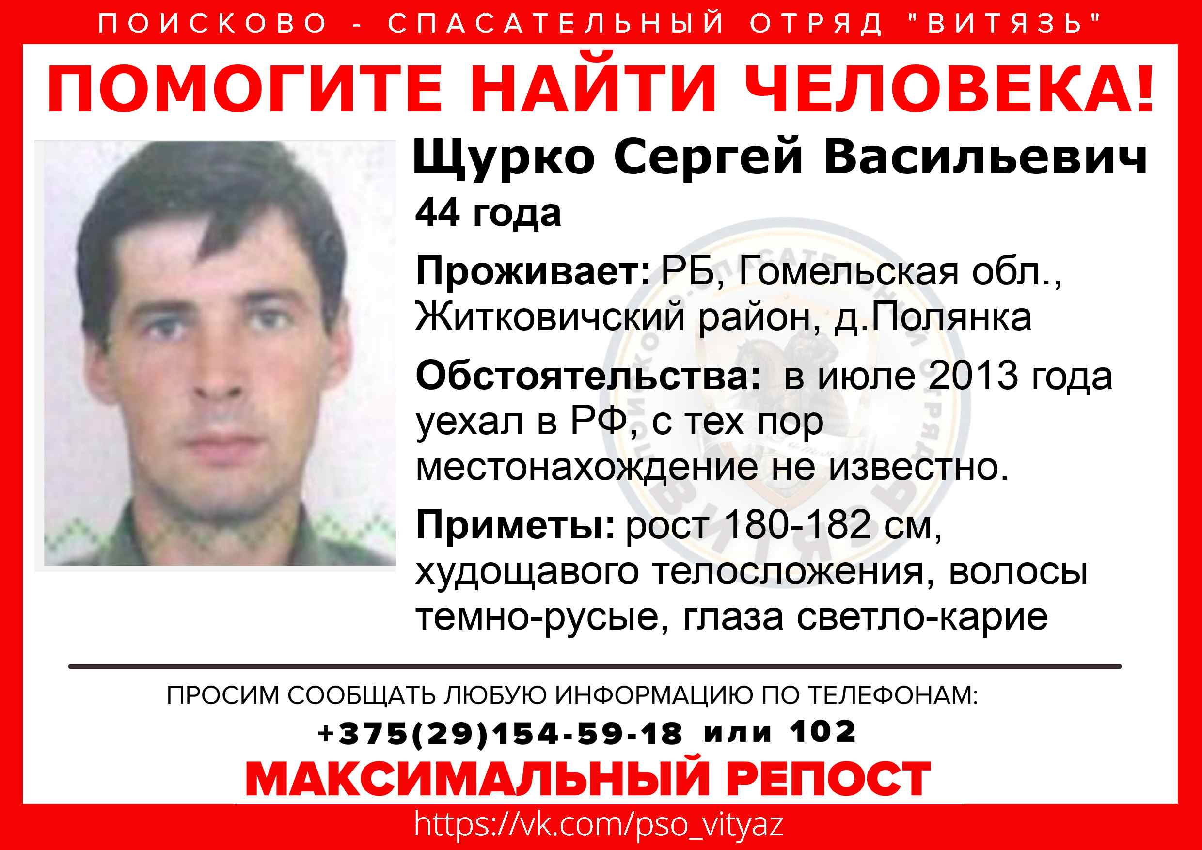 Всех, кто владеет информацией, просим сообщить: ПСО "ВИТЯЗЬ" +375(29)154-59-18 |