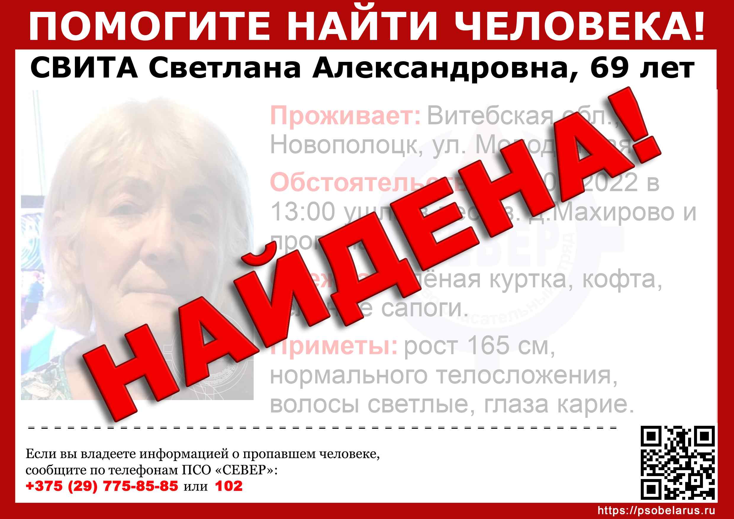 Скачать ориентировкуДля оперативного получения информации о пропавших людях и сборах на поиски можно подписаться на бота оповещения: Телеграм