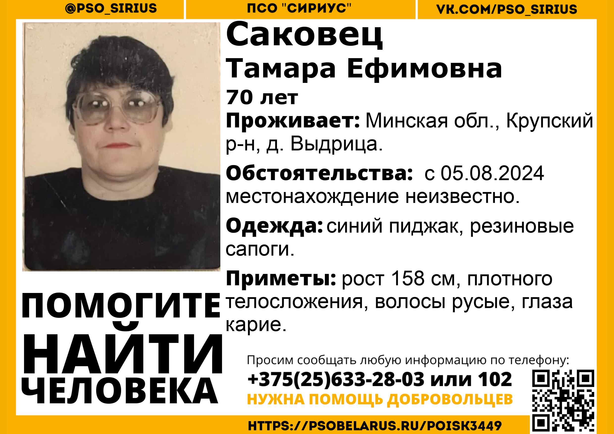 Скачать ориентировкуДля оперативного получения информации о пропавших людях и сборах на поиски можно подписаться на бота оповещения: Телеграм