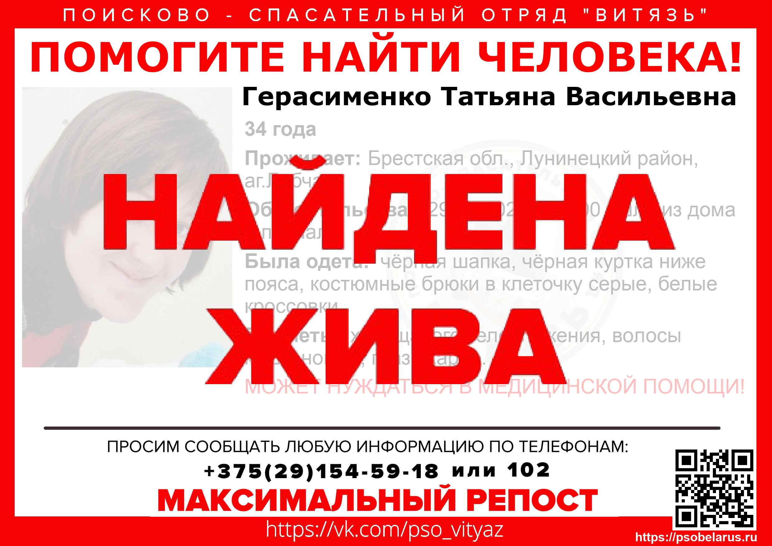 Всех, кто владеет информацией, просим сообщить: ПСО "ВИТЯЗЬ" +375(29)154-59-18 |