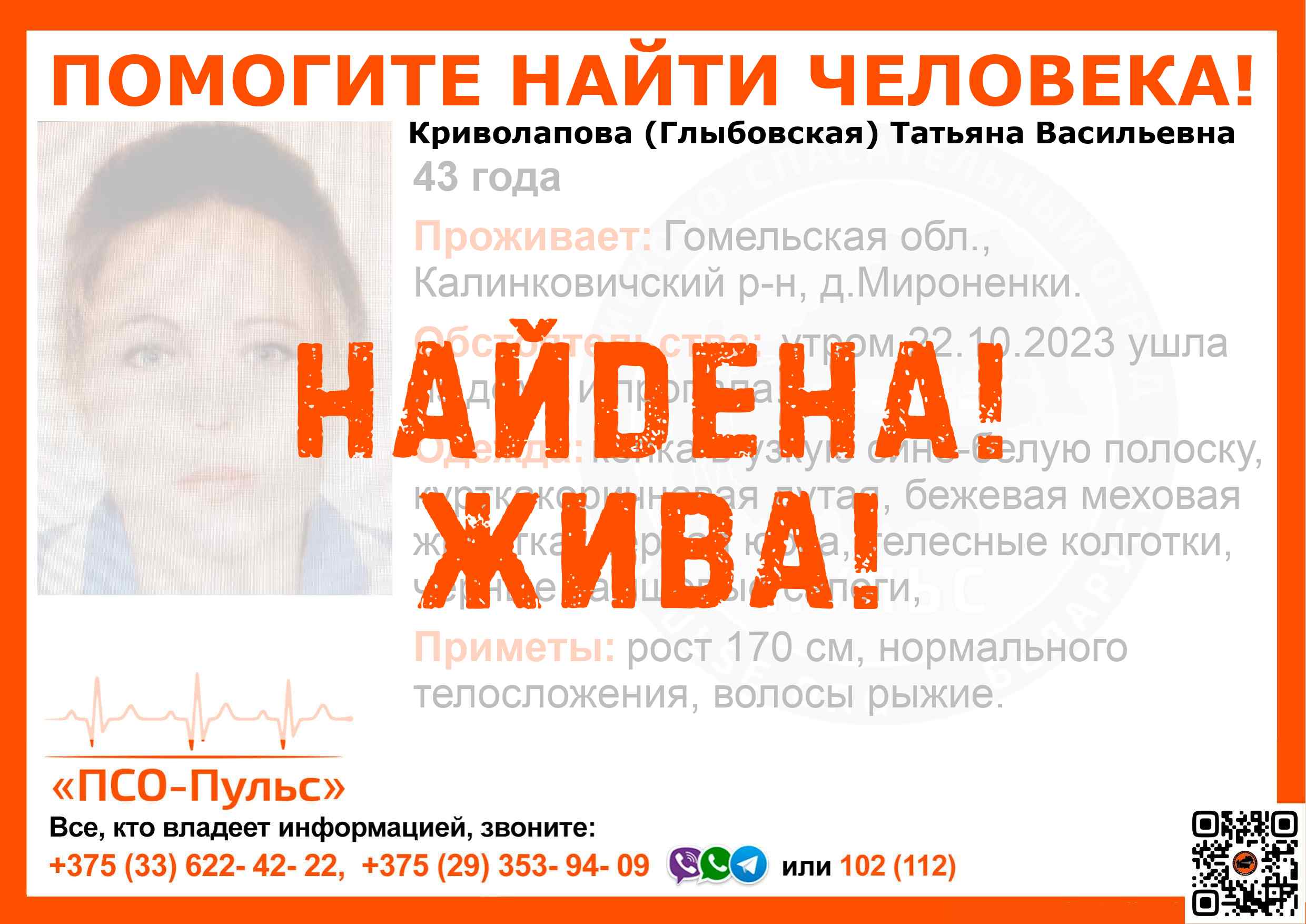 Всех, кто владеет информацией, просим сообщить: ПСО "ПСО-Пульс" +375(33)622-4222 |