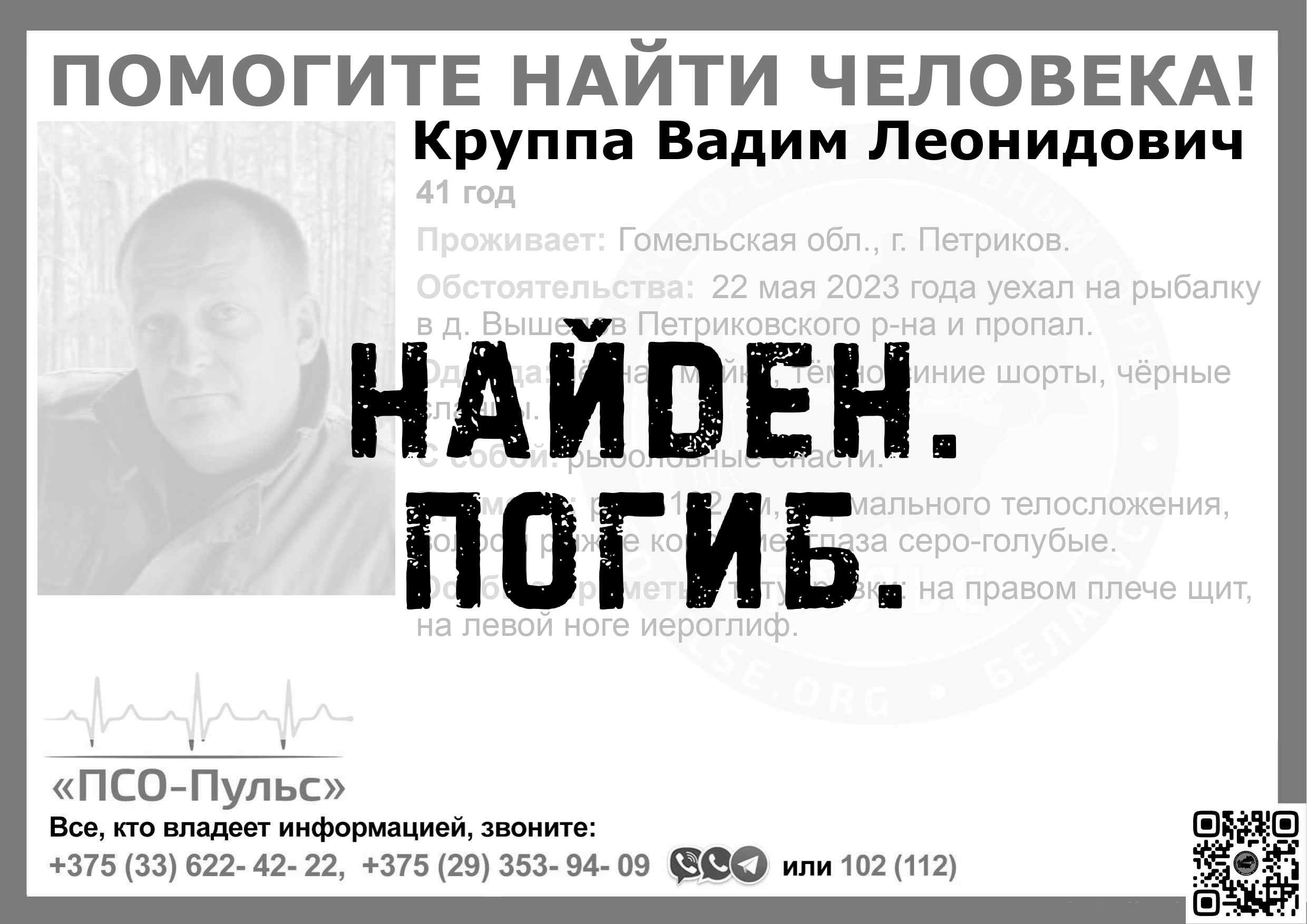 Всех, кто владеет информацией, просим сообщить: ПСО "ПСО-Пульс" +375(33)622-4222 |