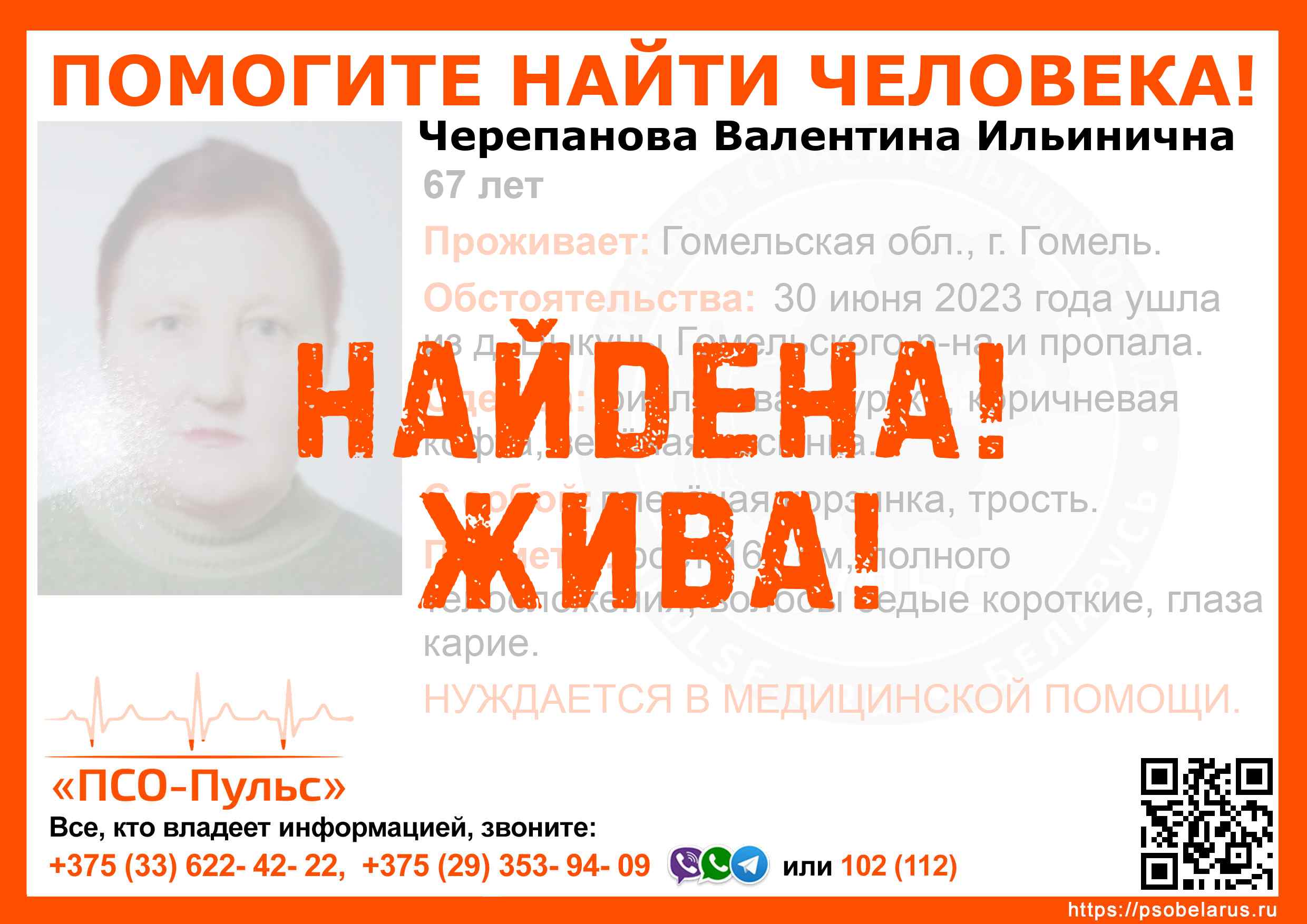 Всех, кто владеет информацией, просим сообщить: ПСО "ПСО-Пульс" +375(33)622-4222 |