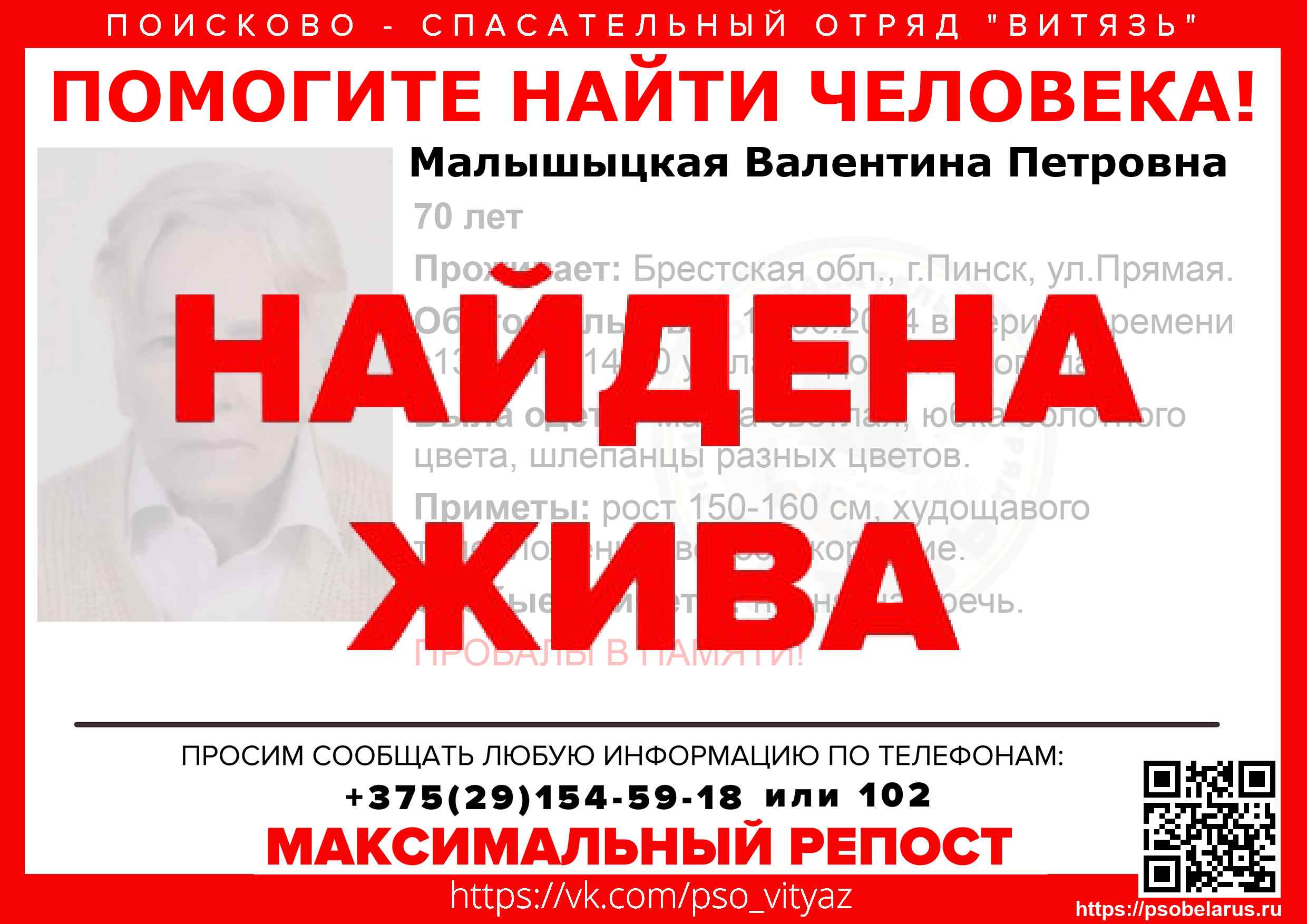 Всех, кто владеет информацией, просим сообщить: ПСО "ВИТЯЗЬ" +375(29)154-59-18 |