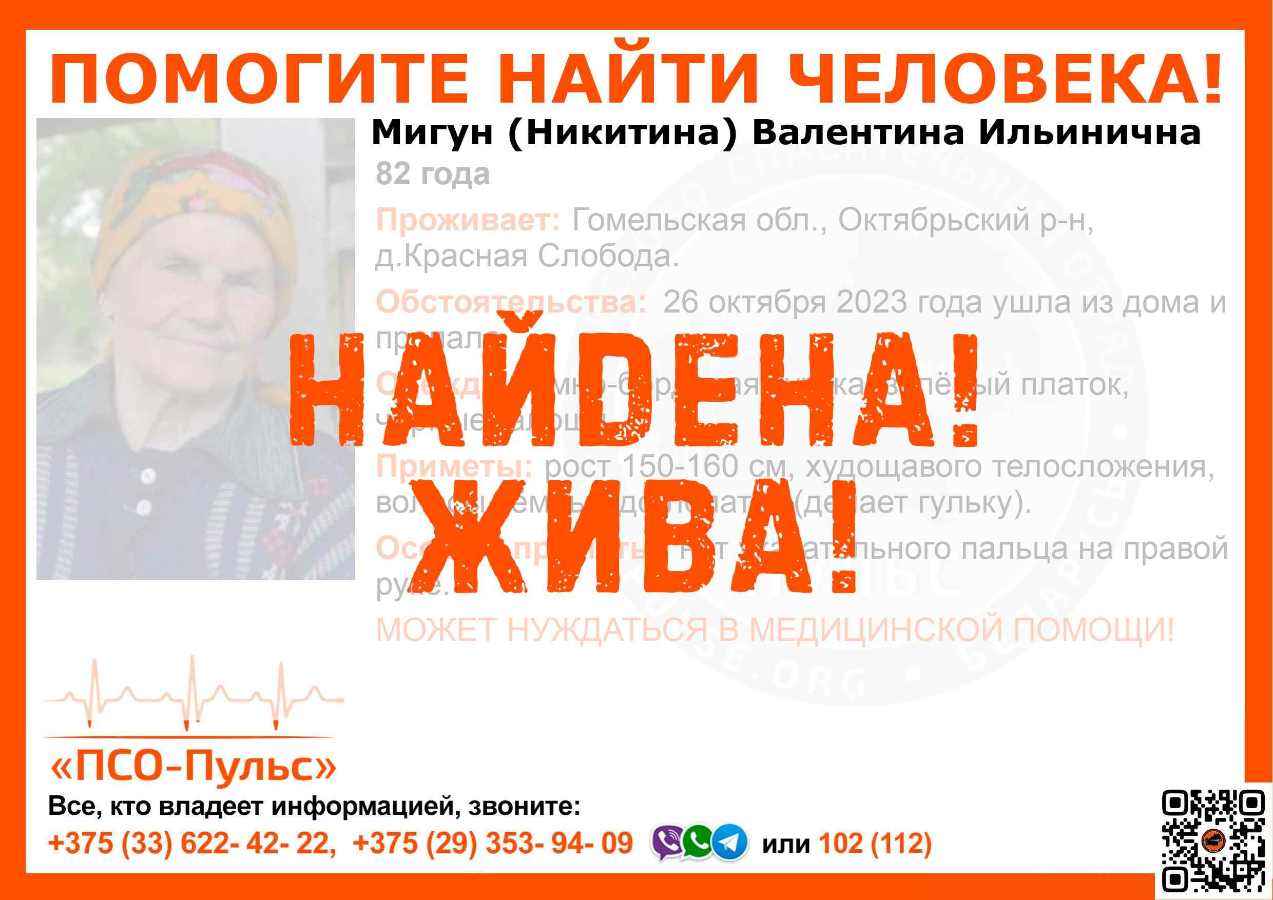 Всех, кто владеет информацией, просим сообщить: ПСО "ПСО-Пульс" +375(33)622-4222 |
