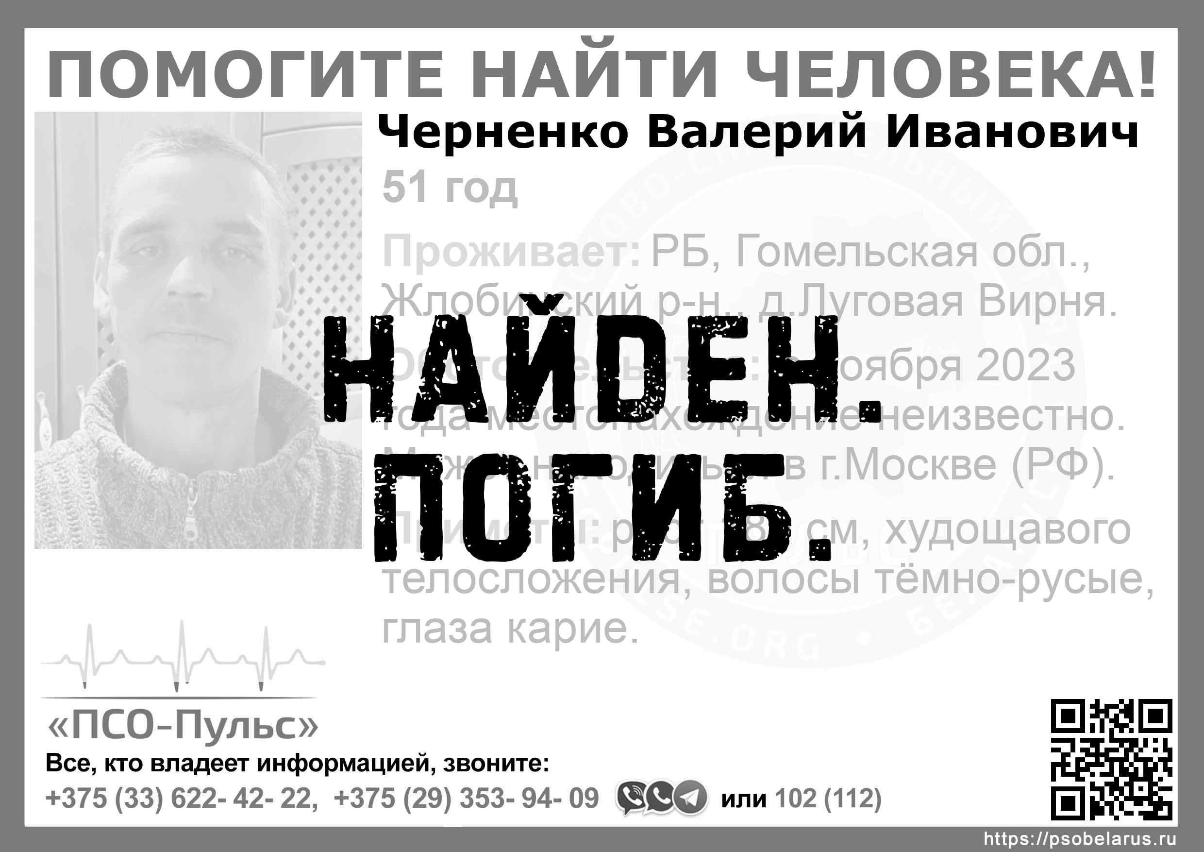 Всех, кто владеет информацией, просим сообщить: ПСО "ПСО-Пульс" +375(33)622-4222 |