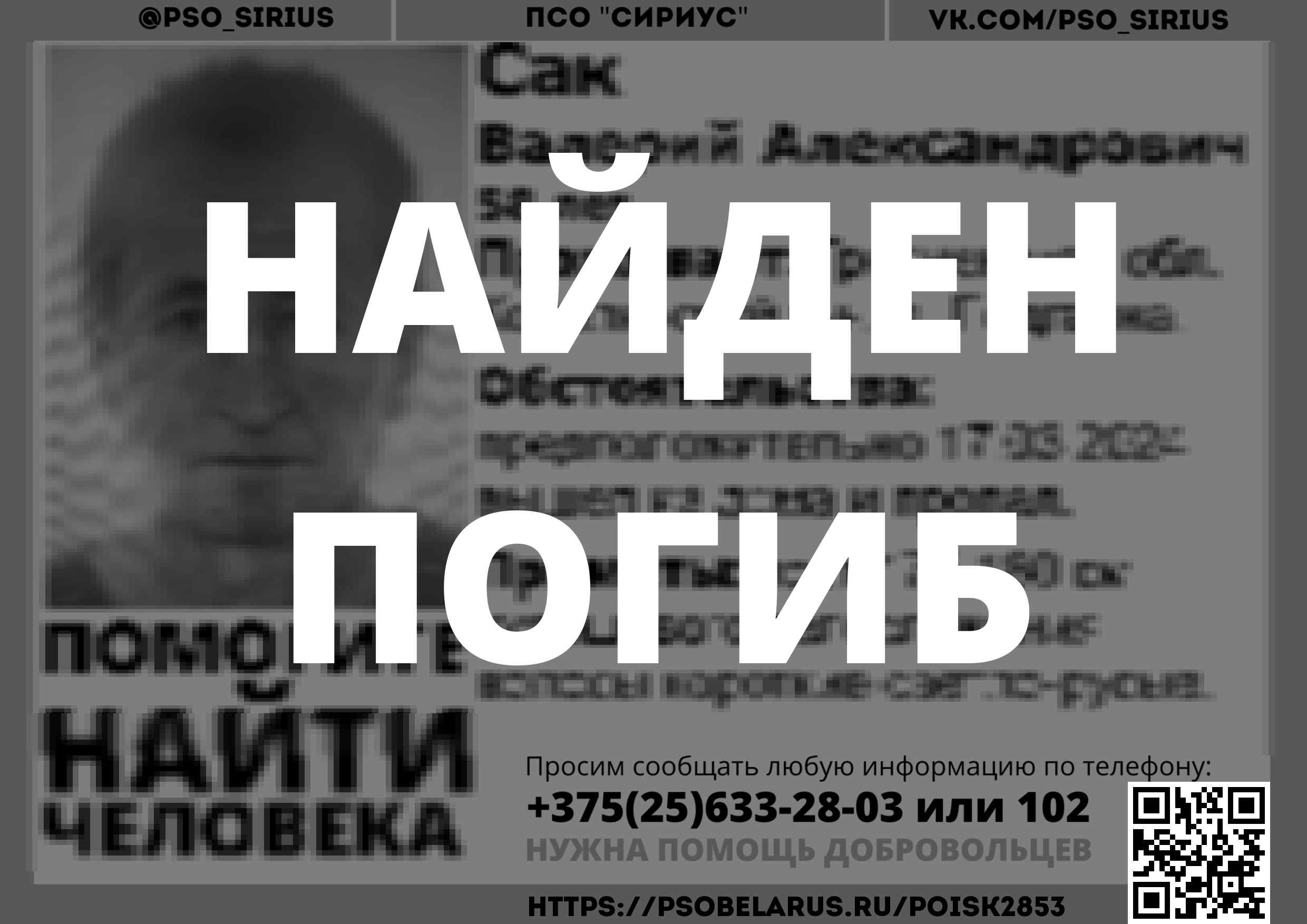 Всех, кто владеет информацией, просим сообщить: ПСО "Сириус" +375(25)633-28-03 |
