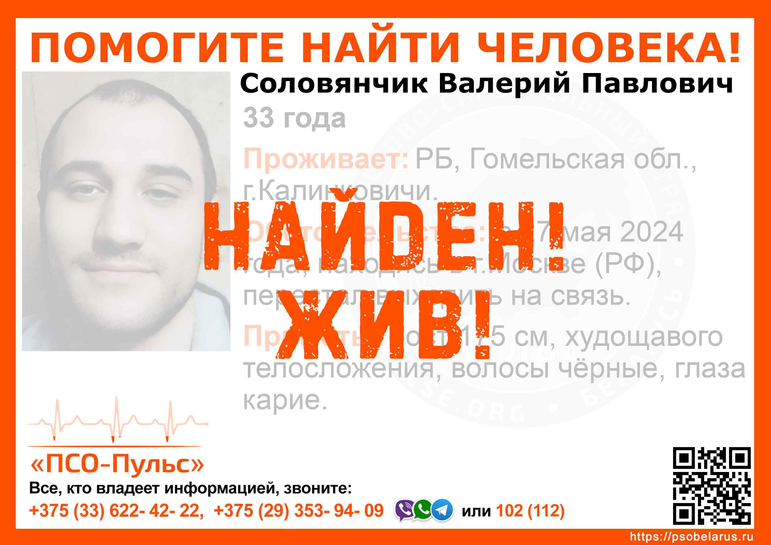 Всех, кто владеет информацией, просим сообщить: ПСО "ПСО-Пульс" +375(33)622-4222 |
