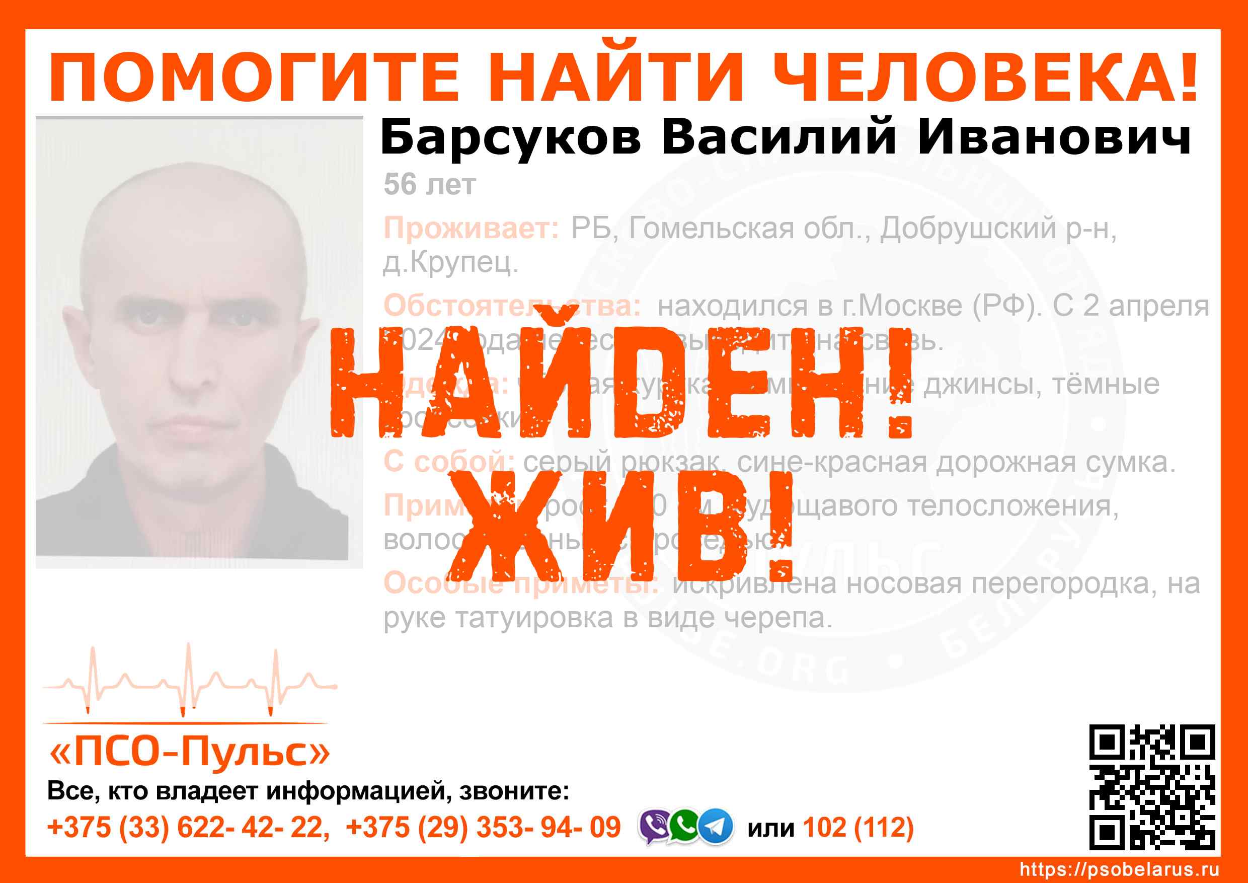 Всех, кто владеет информацией, просим сообщить: ПСО "ПСО-Пульс" +375(33)622-4222 |