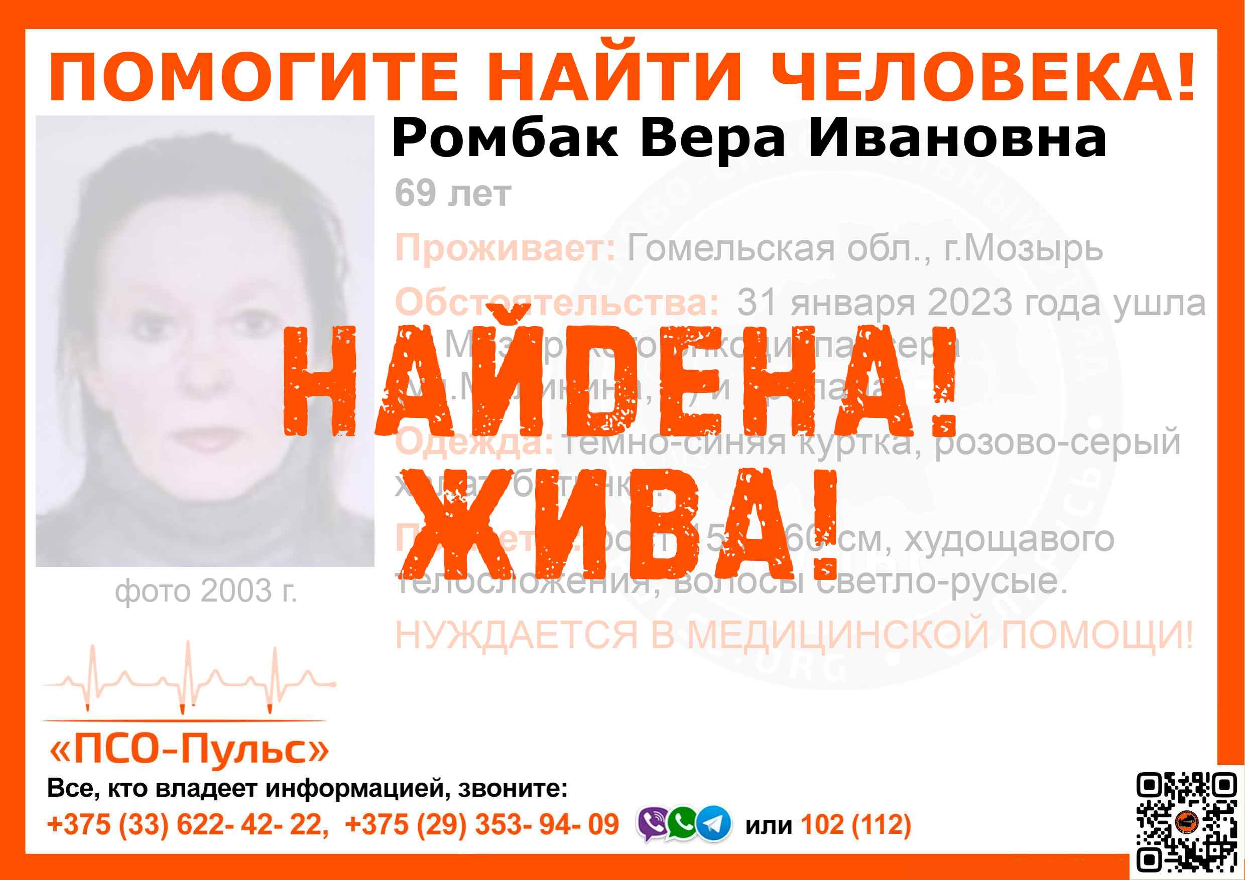 Скачать ориентировкуДля оперативного получения информации о пропавших людях и сборах на поиски можно подписаться на бота оповещения: Телеграм