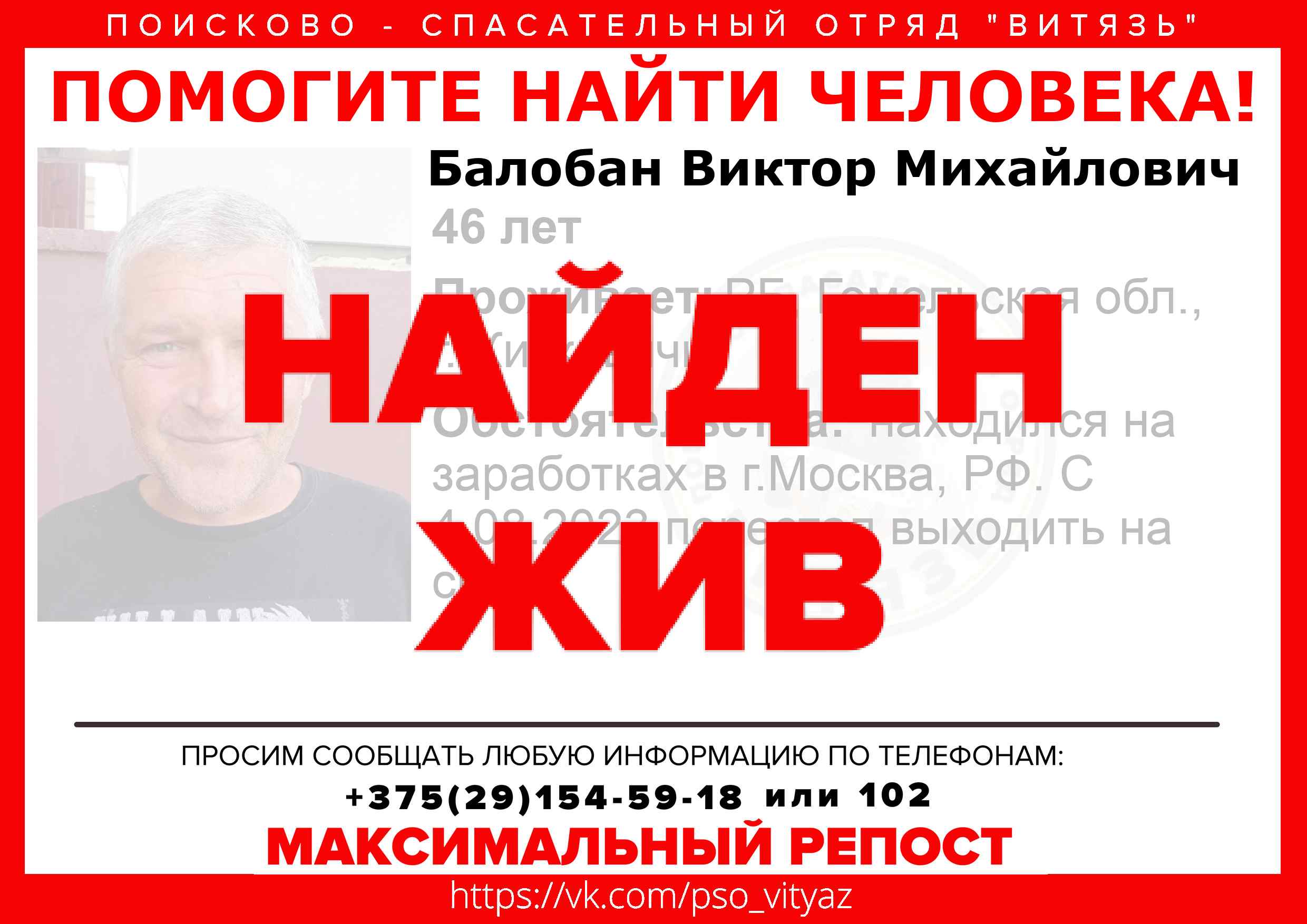 Всех, кто владеет информацией, просим сообщить: ПСО "ВИТЯЗЬ" +375(29)154-59-18 |