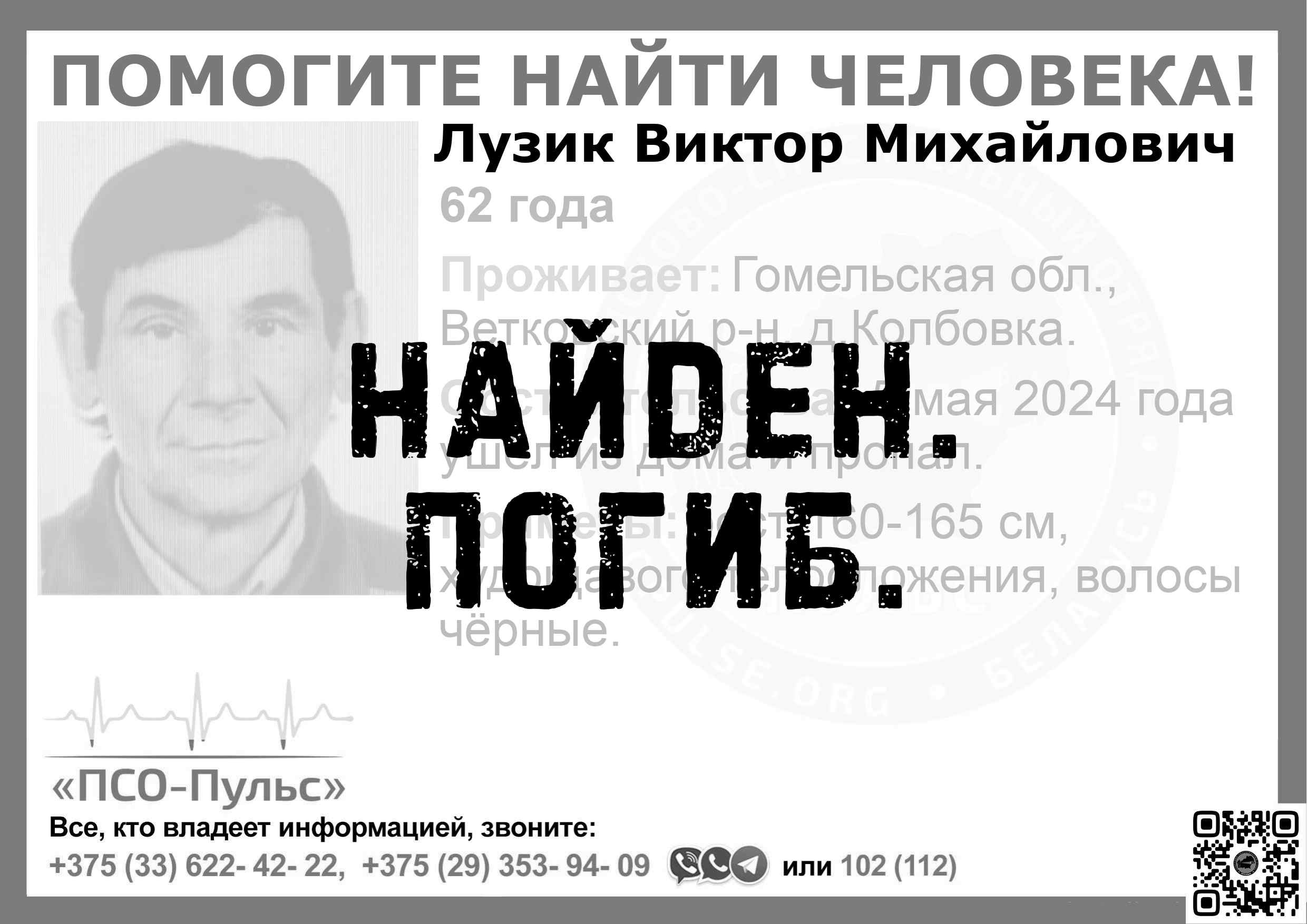 Всех, кто владеет информацией, просим сообщить: ПСО "ПСО-Пульс" +375(33)622-4222 |